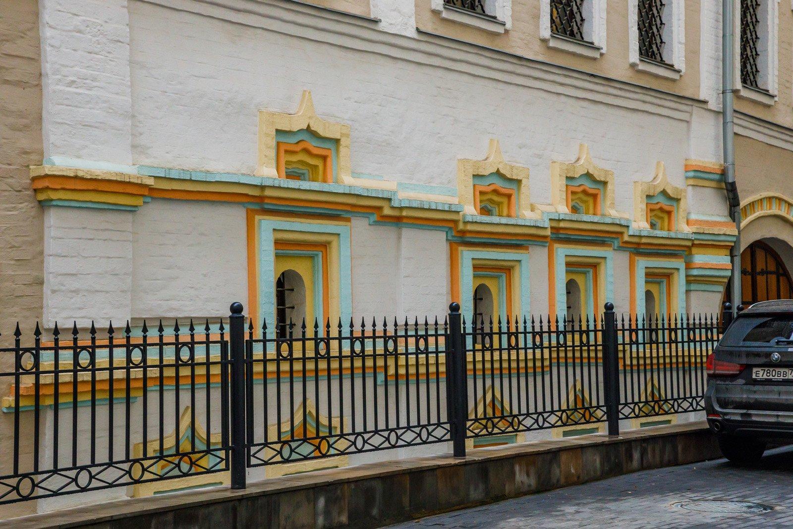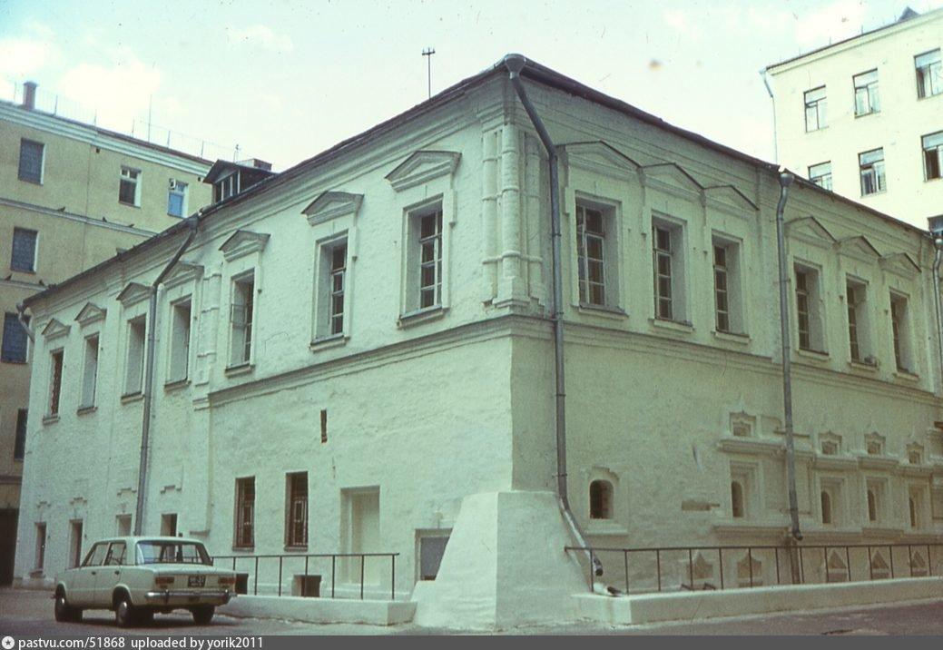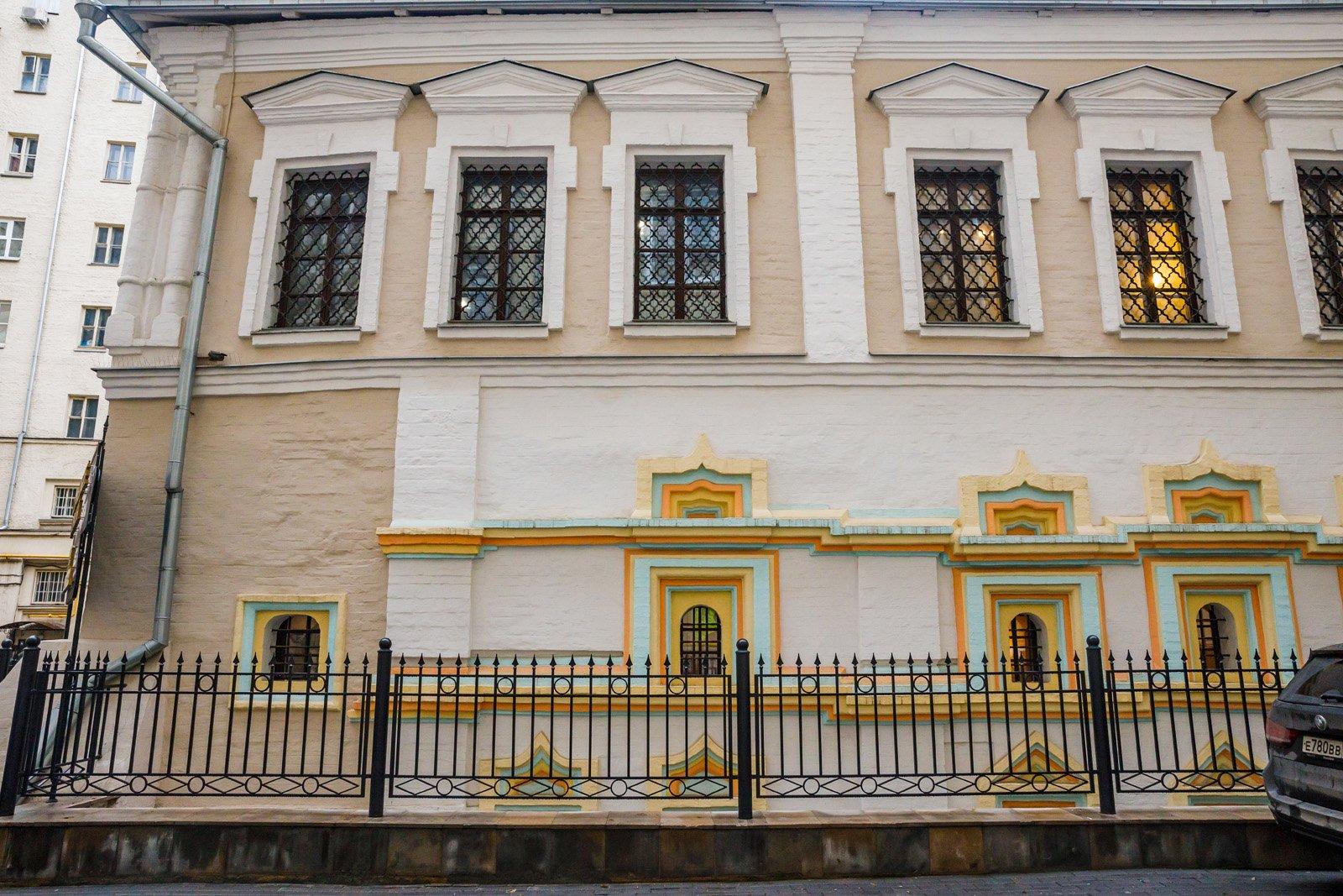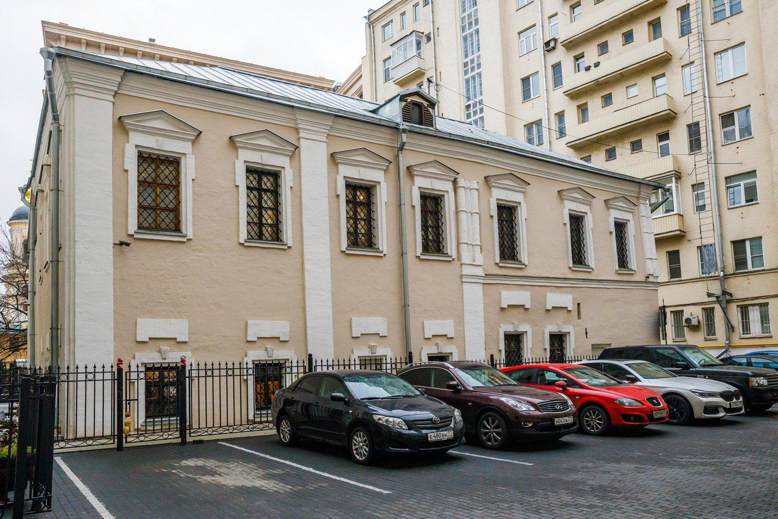 Он и построил каменные палаты, составляющие древнейшую (1650–1660-х гг.) юго-западную часть нынешнего здания. Это подклетный и первый ее этажи. Фасадом палаты обращены были к средневековому переулку между Большой Ордынкой и Лаврушинским переулком, превратившемуся ныне в Ордынский тупик. Исследователи считают эти палаты образцом стиля, переходного от лапидарной средневековой архитектуры к «узорочью» второй половины XVII столетия. Фасадный декор палат, восстановленный реставраторами (некоторые наличники оказались теперь в интерьере расширенного пристройками здания), убеждает в этом: оконные проемы расположены одно над другим, намечая вертикальные оси на фасадах. Углы объема и места примыкания внутренних поперечных стен отмечены лопатками. Наличники подклетного этажа имеют простые треугольные завершения, а на парадном этаже – полуциркульные, со сложными килевидными завершениями. Убранство фасадов дополнял выразительный фриз из профилированных тяг.