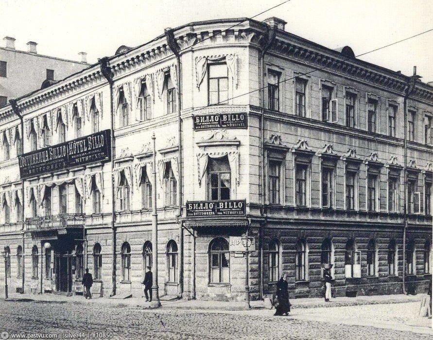 К началу 1870-х все, на тот момент три, владения между Лубянкой и Варсонофьевским сосредоточены в руках жены купца, почетной гражданки Глафиры Александровны Поповой (муж ее К.А. Попов торговал чаем и сахаром и имел фирму «К. и С. Братья Поповы»), последовательно скупавшей участки с 1856 года. Она перестроила угловое владение под трехэтажный доходный дом – гостиницу «Билло». Комнаты с «бельем, чаем, завтраком и обедом» стоят здесь 4 рубля в сутки. Известно, что в 1863 году в гостинице останавливался немецкий композитор Рихард Вагнер, а в 1867-м – французский композитор и дирижер Гектор Берлиоз. Здесь же иностранные купцы, жившие в Москве, собирались и обменивались почтовыми марками.