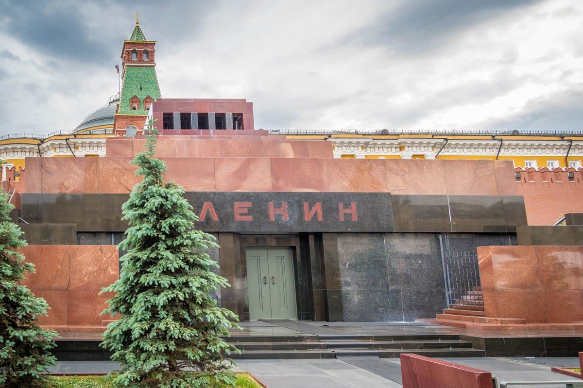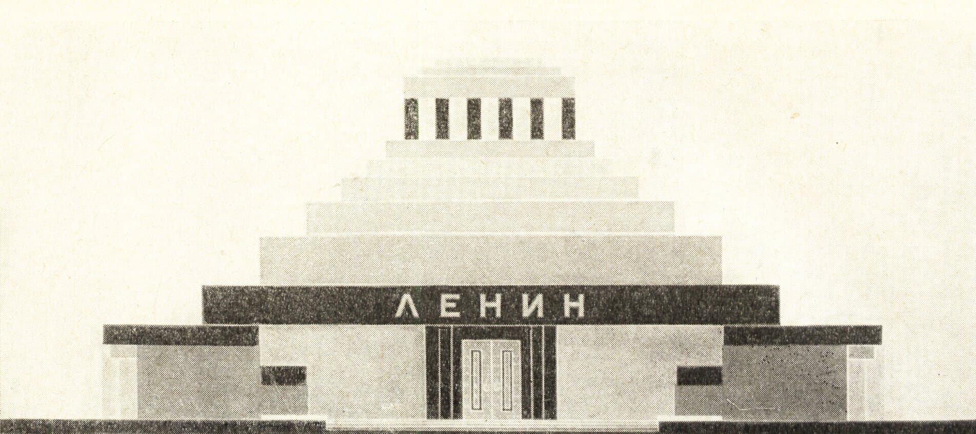 24 января 1924 года Щусеву поручили к похоронам Ленина возвести временный склеп. За трое суток в тридцатиградусный мороз построен куб 8 × 8 м высотой около 4 м, перекрытый трёхступенчатой пирамидой. Центральный объём-склеп соединялся с двумя боковыми тамбурами входа и выхода; фасады обшили доской «ёлкой» и окрасили в тёмно-серый. Посетители спускались ниже уровня площади, обходили гроб и поднимались другой лестницей, что обеспечило непрерывный поток.