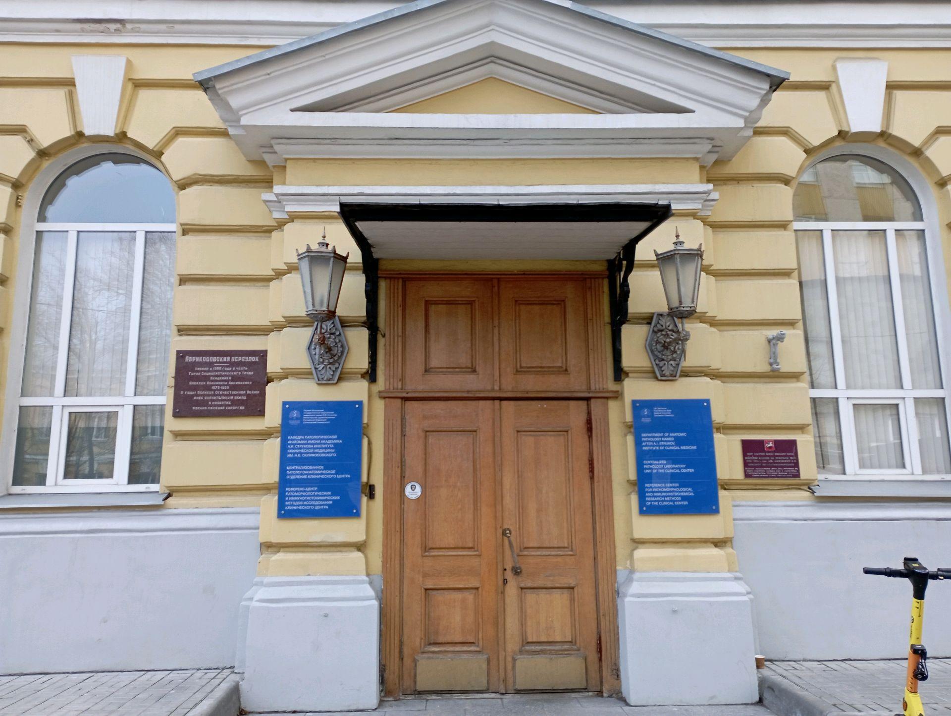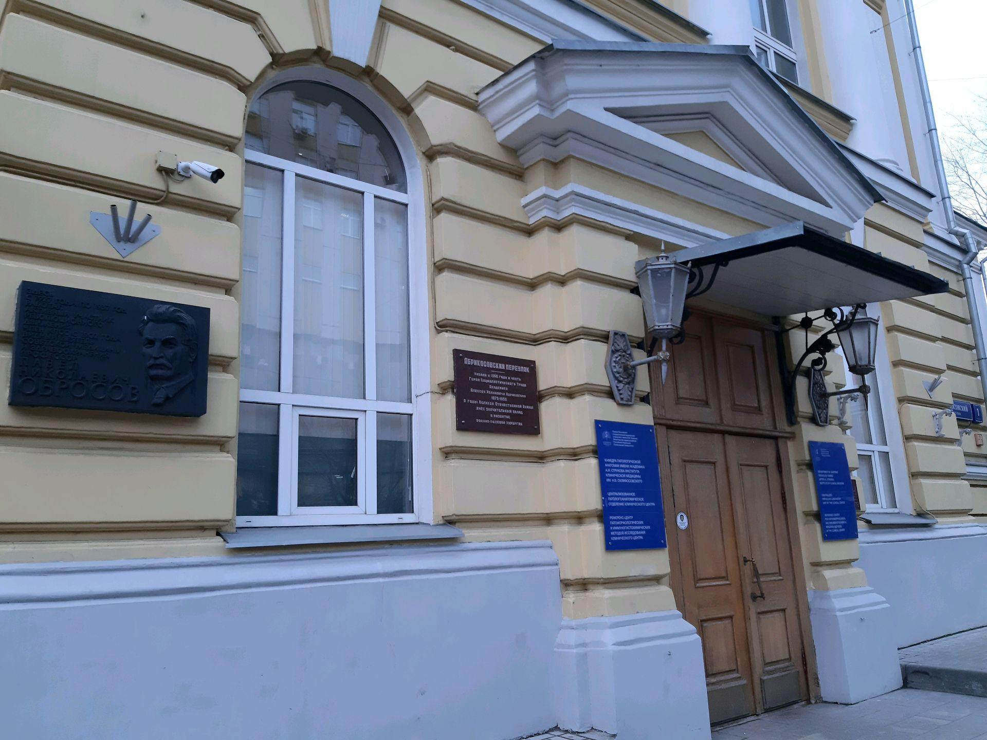 Здание построено на средства профессора Московского университета А.И. Абрикосова, внука создателя кондитерской фабрики «А.И. Абрикосов и сыновья». Бюст заслуженного российского и советского медика-патологоанатома, академика А.И. Абрикосова можно увидеть в лестничном холле второго этажа здания.