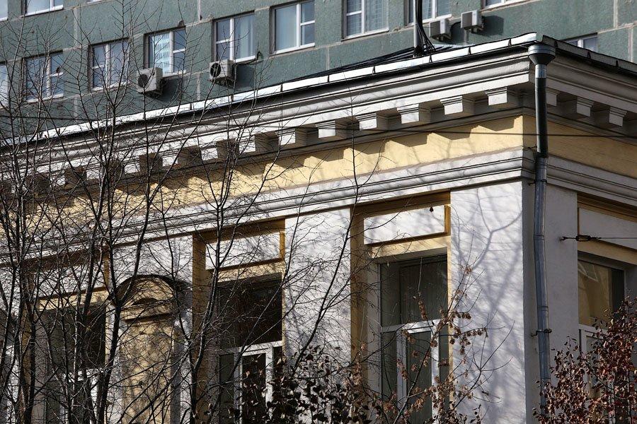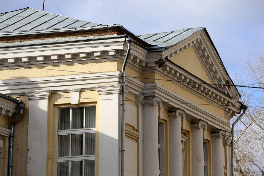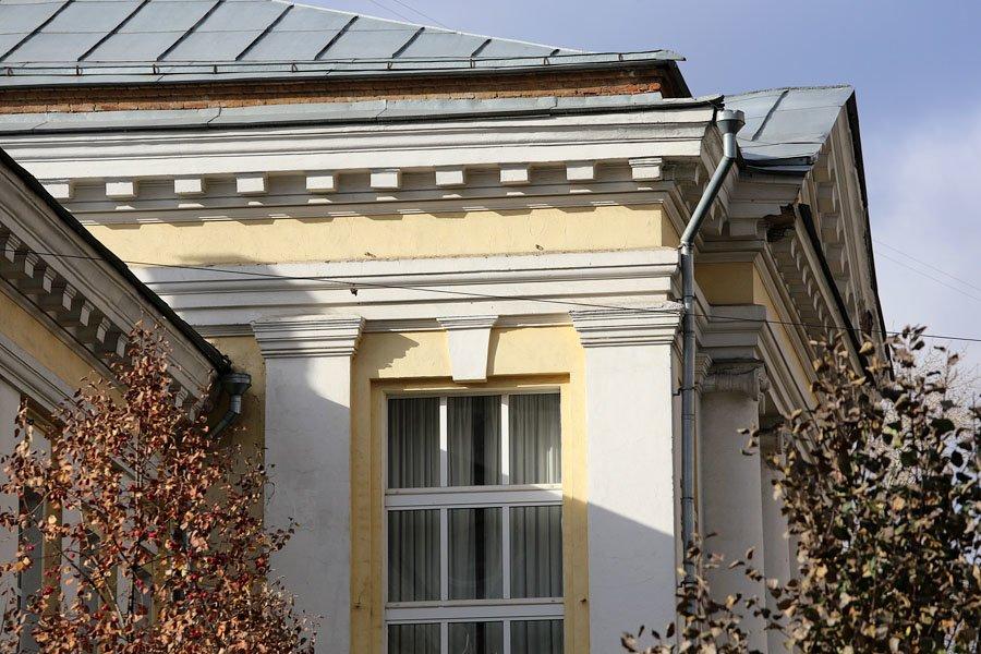 Двухэтажное здание стоит на высоком цокольном полуподвале, который ранее занимали квартиры служителей института.