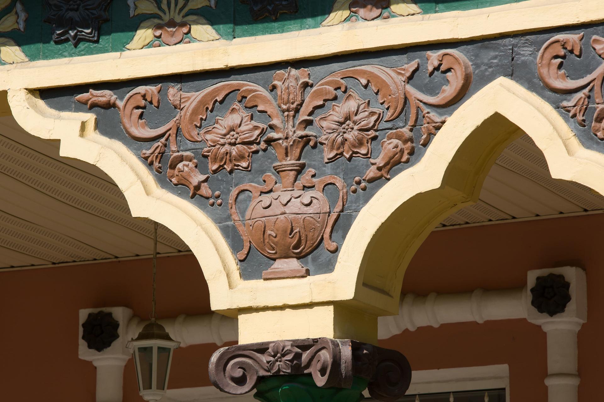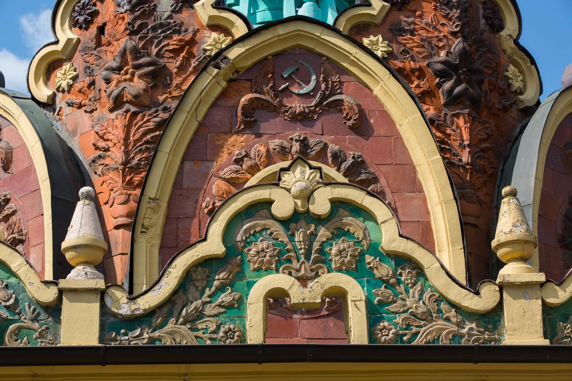 Интерьер основного зала, повторяющего восьмигранную форму шатра, был обставлен шкафами и прилавками, сходными по декору с наружным оформлением здания.
