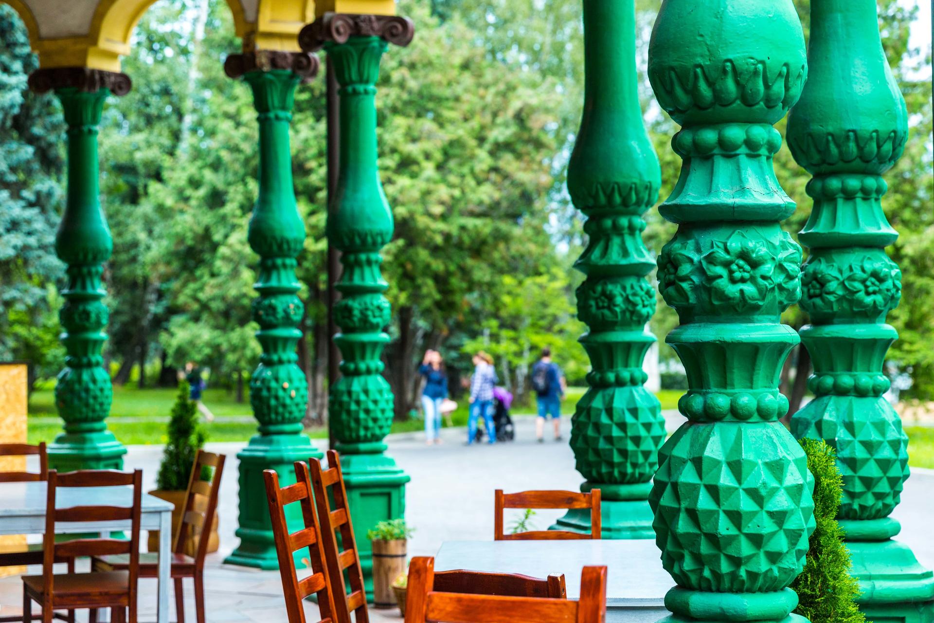 Павильон построен в форме шатра, который имеет в плане восьмиугольную форму. Небольшое внутреннее помещение окружено просторной галереей с деревянными колоннами. Фигурный парапет и кокошники украшены керамическими узорами с изображениями растения табака и цветами, а также неизбежными серпами и молотами. Шатер венчает высокий металлический шпиль, который некогда заканчивался фирменной эмблемой «Главтабака». Вся расцветка составлена из трех цветов – терракота, желтого и зеленого.