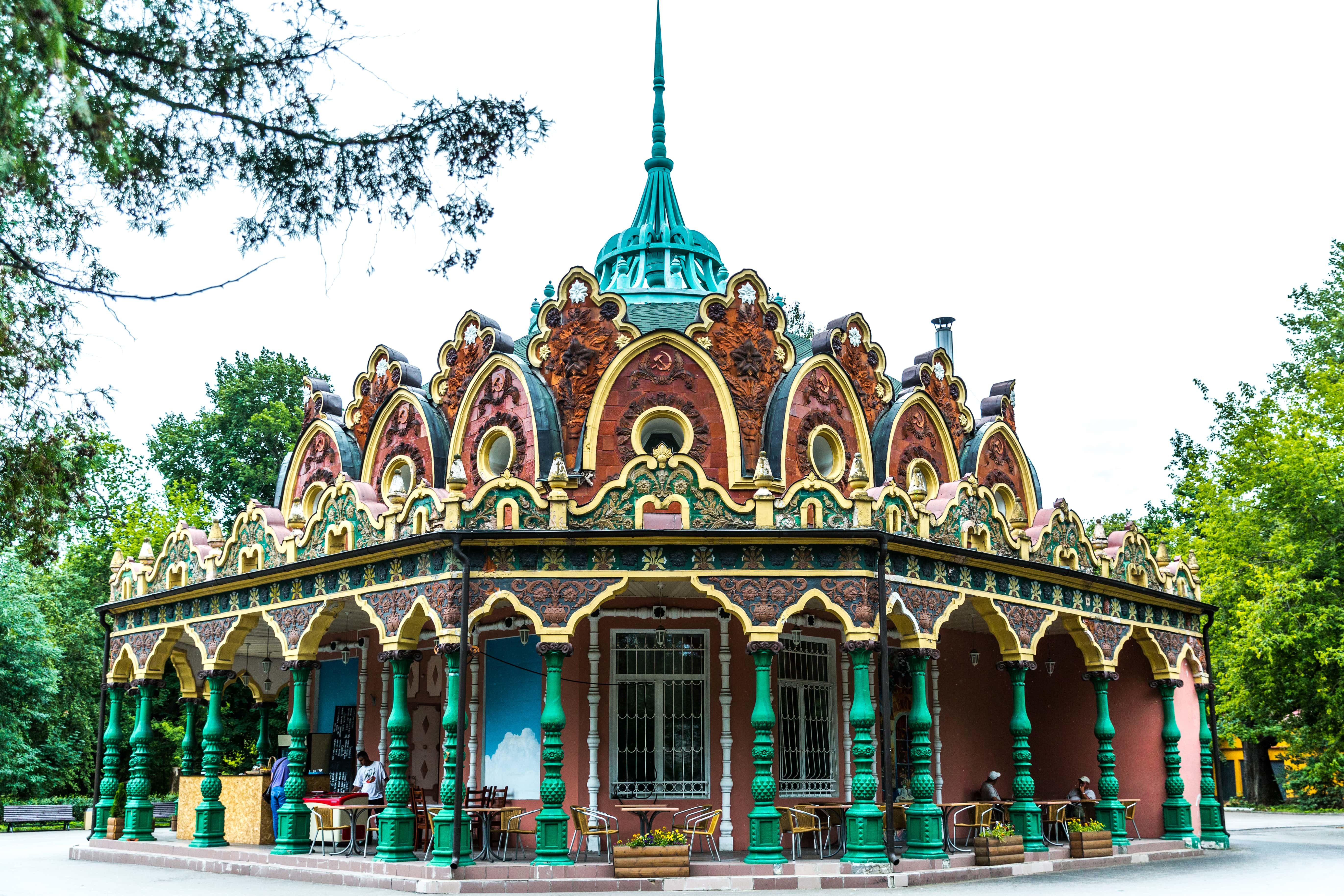 Внешне павильон напоминает не то богатую юрту, не то островерхую шапку кочевника. Существует множество трактовок; разные наблюдатели видят тут и турецкие, и индийские мотивы. Несомненно одно – постройка оставляет безошибочное ощущение экзотической фантазии. Впрочем, при желании тут можно найти и русские веяния; путеводитель по ВСХВ 1954 г. указывает, например, что павильон создан в стиле хохломской росписи. В своей книге об архитектуре ВСХВ А. Зиновьев остроумно заметил, что композиция павильона «Главтабак» напоминает купольную часть Петровского путевого дворца архитектора М. Казакова.