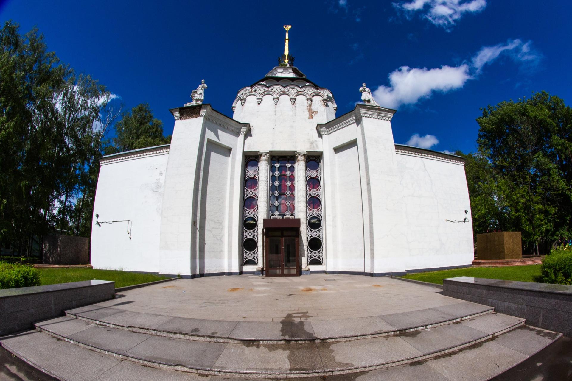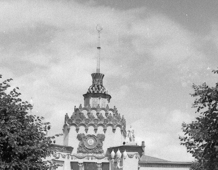 Сквозь деревья издалека виден позолоченный шпиль павильона «Центросоюз» высотой более 30 м. Он увенчан серпом и молотом в обрамлении венка, а в основании шпиля установлен металлический сноп. Центральный объем павильона, состоящий из трех ярусов арок-кокошников, открыто цитирует архитектуру русских храмов. Кокошник – декоративный элемент, который использовался для украшения церквей начиная с XVI в. и вплоть до современных стилизаций под древнее церковное зодчество.