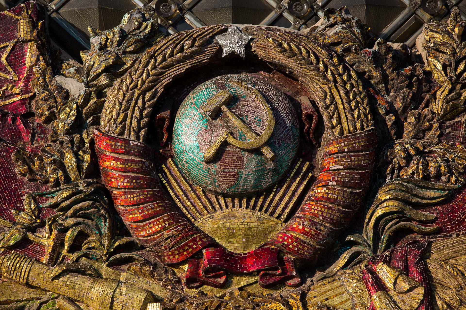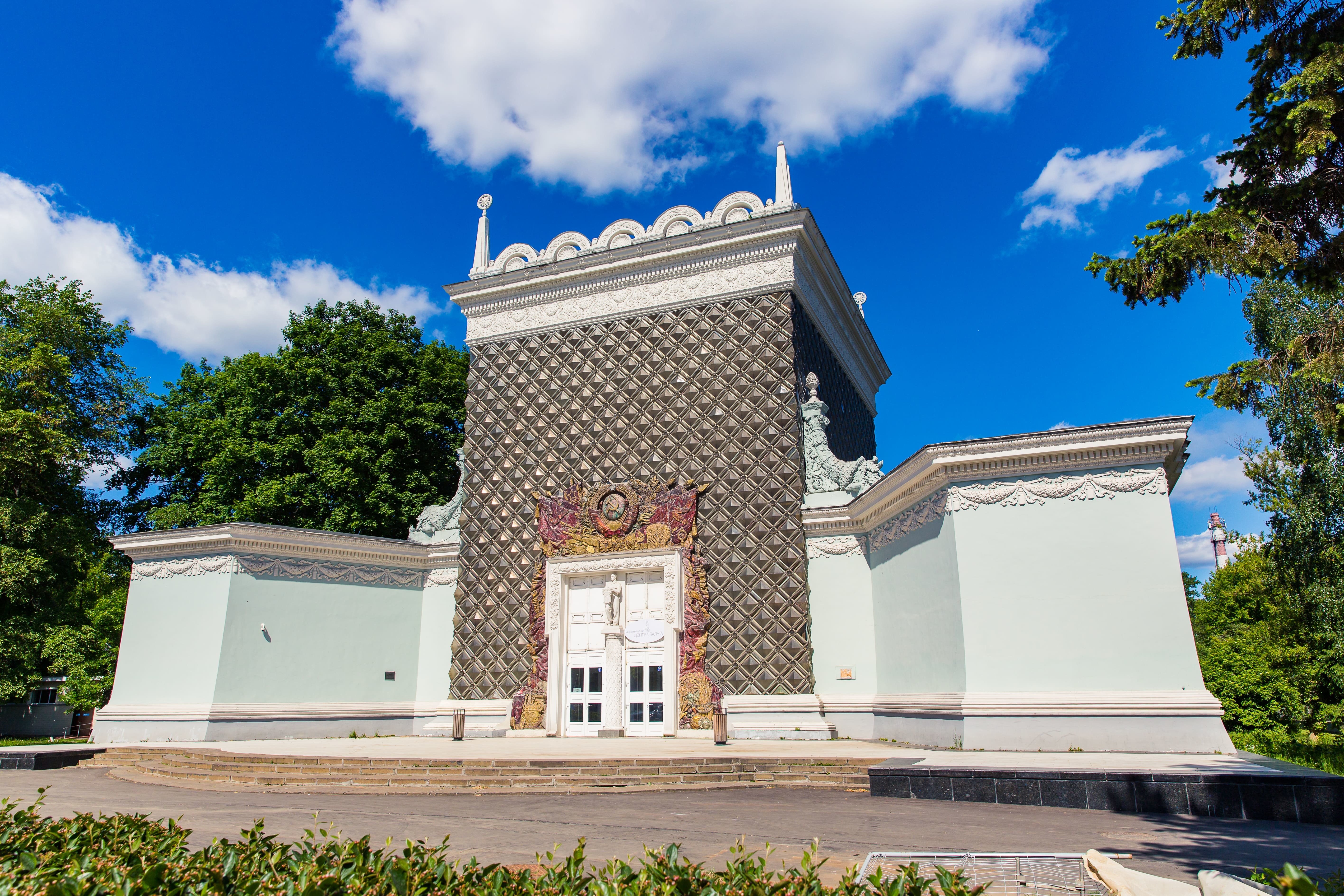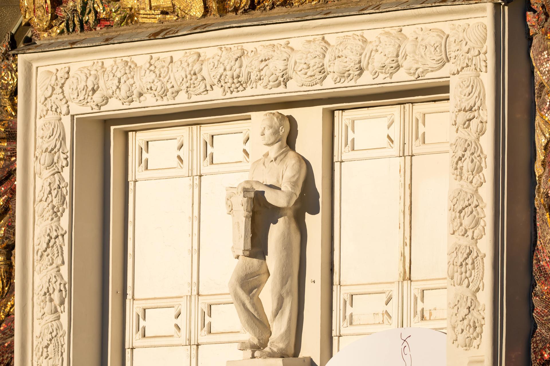 Стеклянная плоскость фасада неожиданно сочетается с роскошным скульптурным обрамлением входных дверей ‒ от уровня земли до половины высоты здания. Скульптурный рельеф облицован цветной смальтой (нигде больше на ВДНХ нет возможности так близко рассмотреть этот декоративный материал). Наверху композиции находится герб СССР в обрамлении парадных знамен. В мозаичных складках можно рассмотреть отбойный молоток, мастерок и другие строительные инструменты, а также обязательные для сельскохозяйственной выставки снопы и овощи. Над дверьми установлена скульптура строителя, который держит в руках капитель колонны ионического ордера. Боковые крылья здания украшены лепными гирляндами.