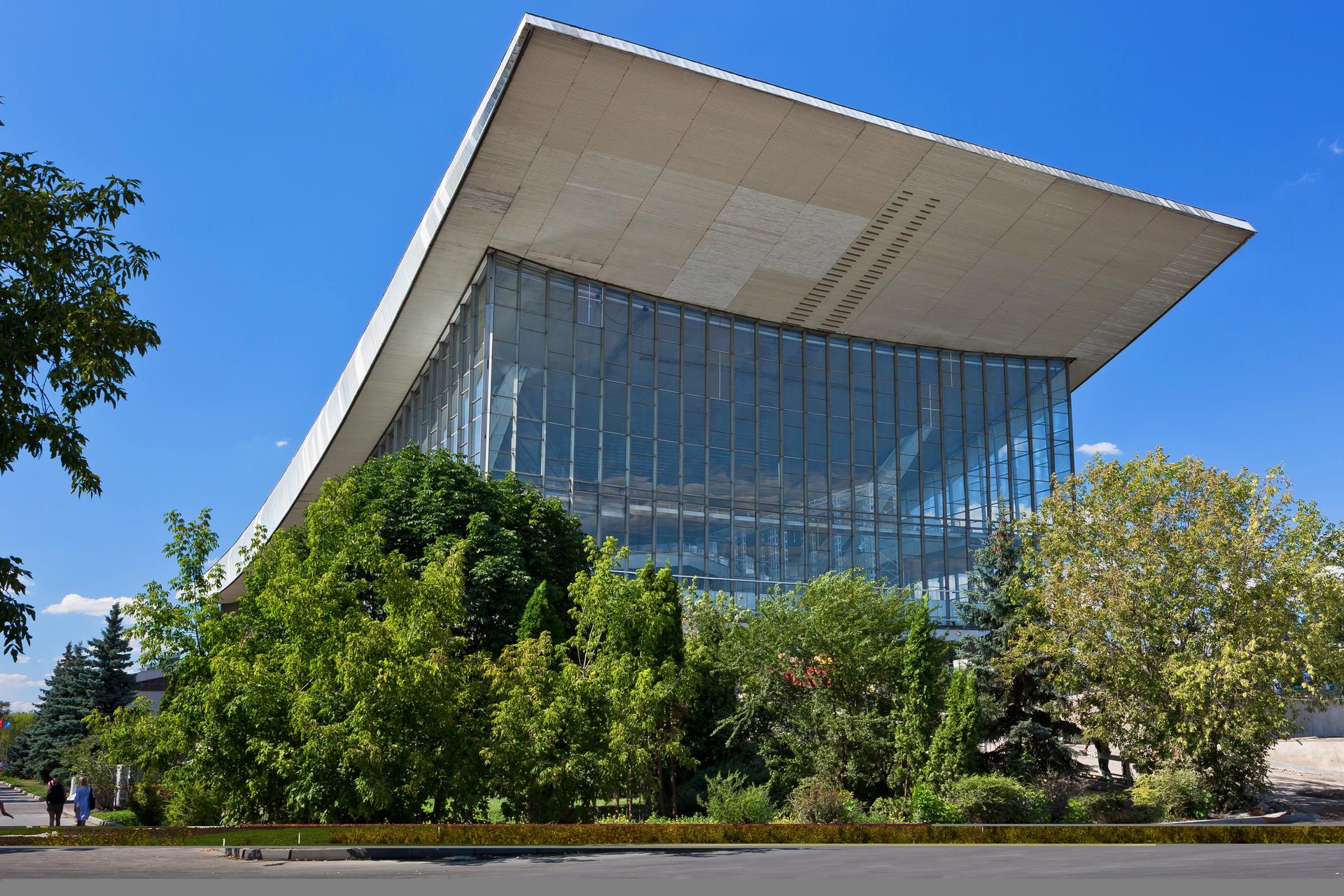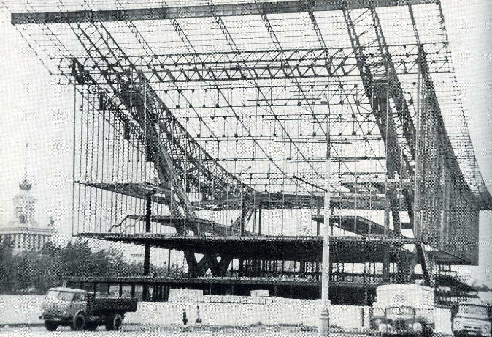 Сооружение, созданное архитекторами М. В. Посохиным, А. А. Мндоянцем и Б. И. Тхором, и в самом деле оказалось выдающимся. Эффектная кровля с большим козырьком держится на четырех у-образных стальных опорах, на которых укреплены перекрытия антресолей. Основной объем, поднимающийся над стилобатом, имеет полностью стеклянные стены, так что массивное здание кажется невесомым. Все экспозиционные уровни – антресоли, террасы – хорошо просматриваются снаружи. Особенно эффектно освещенный павильон смотрелся в ночное время.