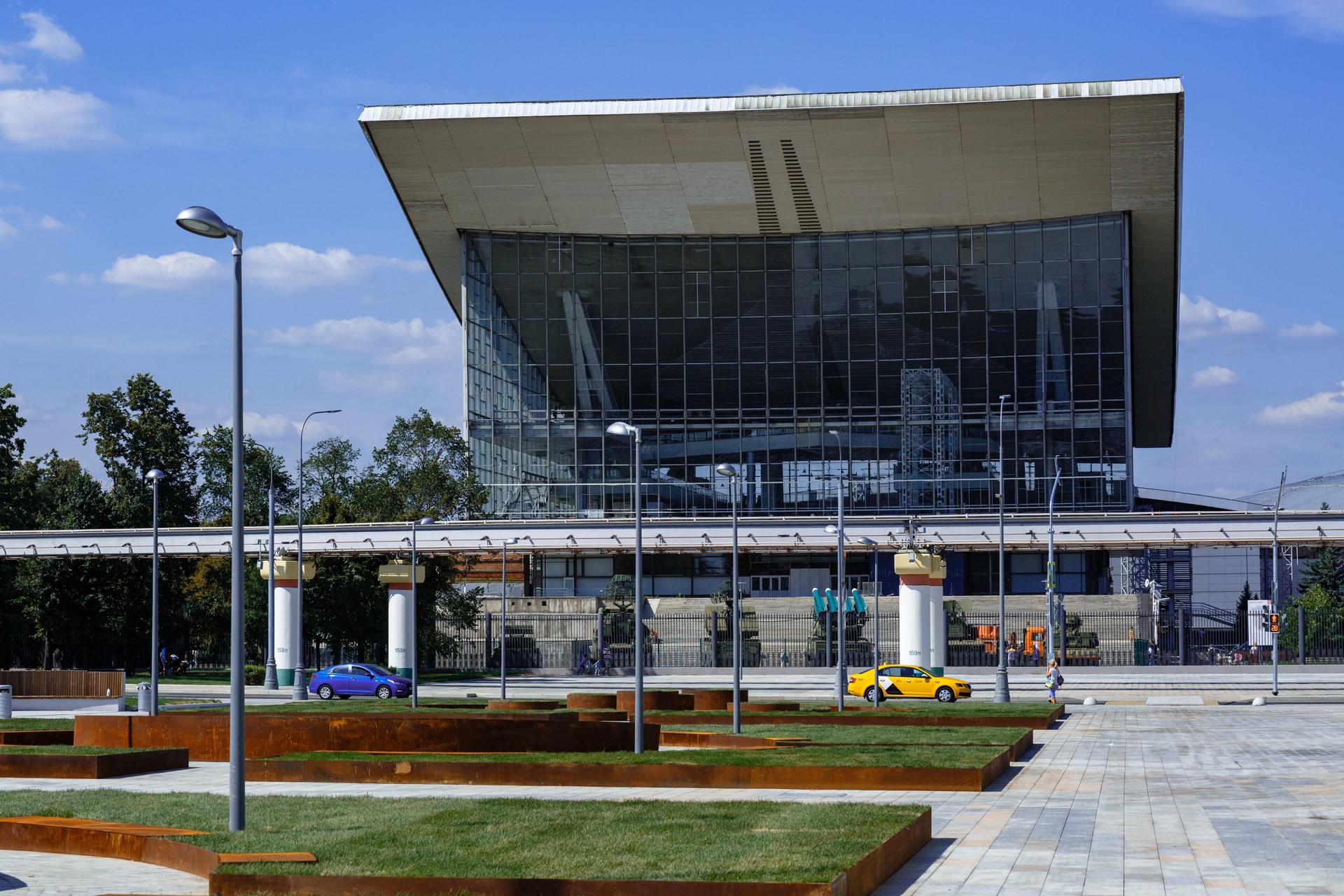 Стена главного фасада павильона немного наклонена вперед, чтобы придать всей постройке дополнительную динамику. Сквозь фасадное стекло виден узор на потолке из алюминиевых пластин, очертаниями напоминающий первый в мире сверхзвуковой пассажирский самолет Ту-144, строительство которого как раз завершалось в то время.