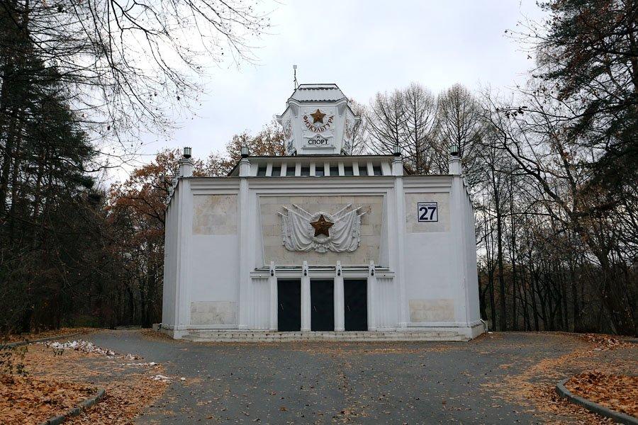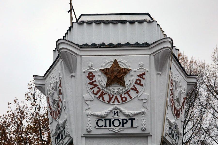 Многогранная в плане постройка увенчана внушительным пятигранником, служившим постаментом для крупной скульптурной группы атлетов с флагами (демонтирована в 1960-е годы). Первоначально главный фасад украшал барельеф с профилями Маркса, Энгельса, Ленина и Сталина, но в 1956 году его заменили барельефом со знаком ГТО («Готов к труду и обороне»). На боковом фасаде сохранилась мраморная доска с изречением М.И. Калинина о значении спорта в жизни «уверенно смотрящего вперёд человека». На крыше сохраняются небольшие изящные фонари, если их отремонтировать, павильон получит оригинальную подсветку. Значок ГТО с фигурой атлета является основным мотивом внешнего декора, а напротив павильона сохранились две скульптуры альпинистов авторства скульптора и одновременно мастера спорта СССР Евгения Абалакова. Ввиду плохого технического состояния в последние годы скульптуры накрыты коробами. Многие годы в павильоне демонстрировались награды советских спортсменов, но последние двадцать лет он пустует и ветшает. При этом по яркости архитектурного решения эта постройка заслуживает статуса объекта культурного наследия, в случае проведения ее научной реставрации на Выставку вернется один из ее ярких акцентов.