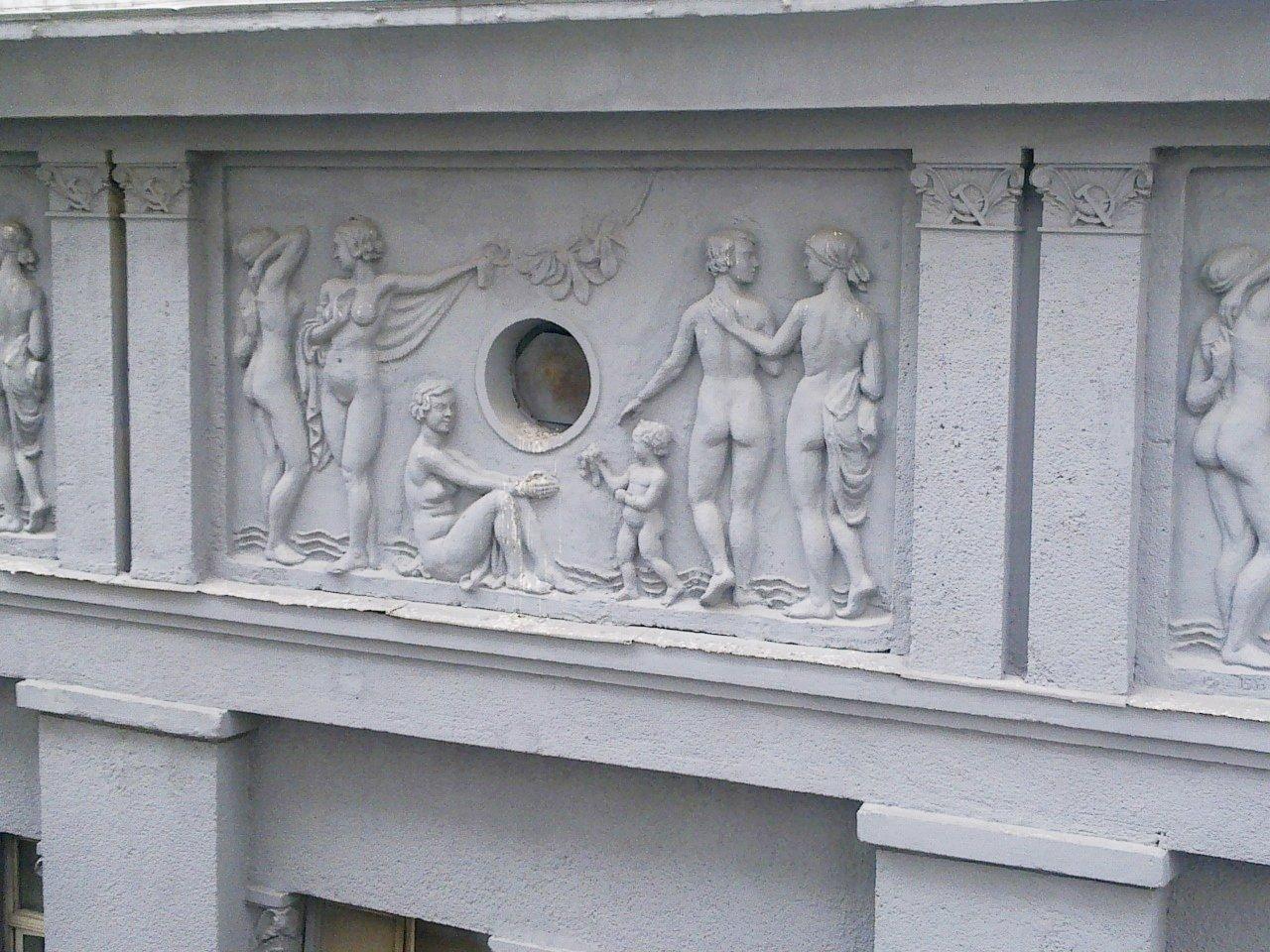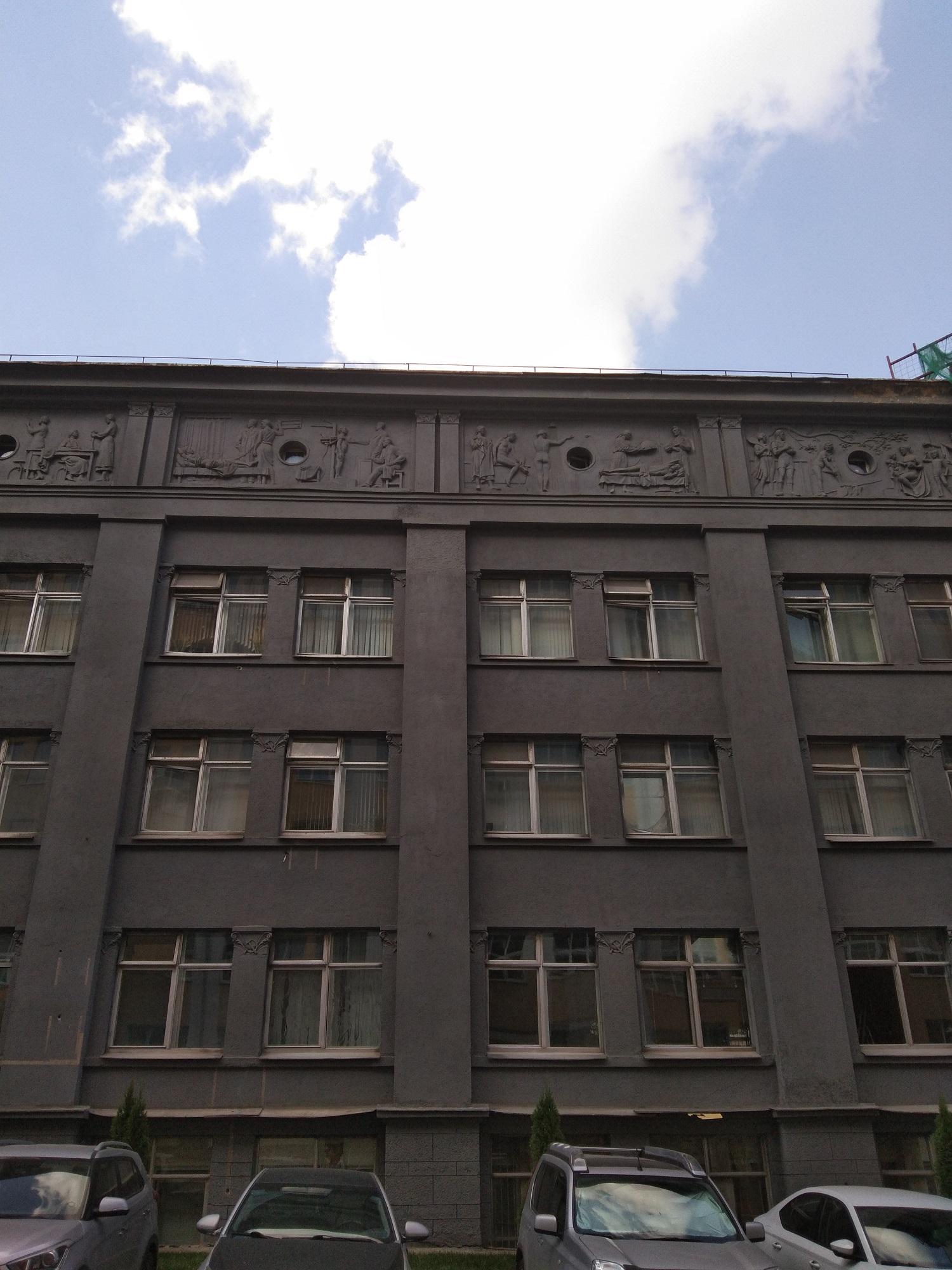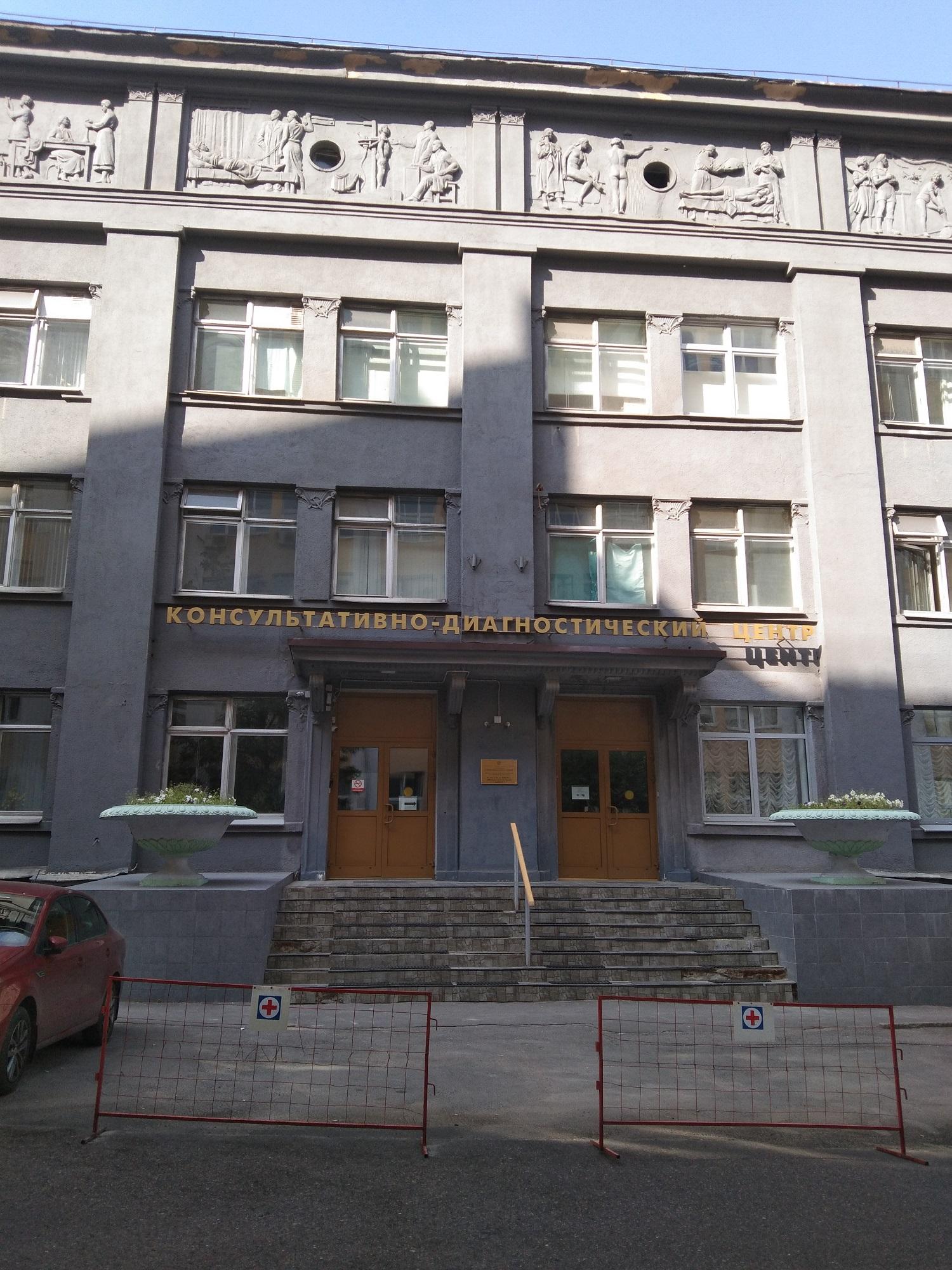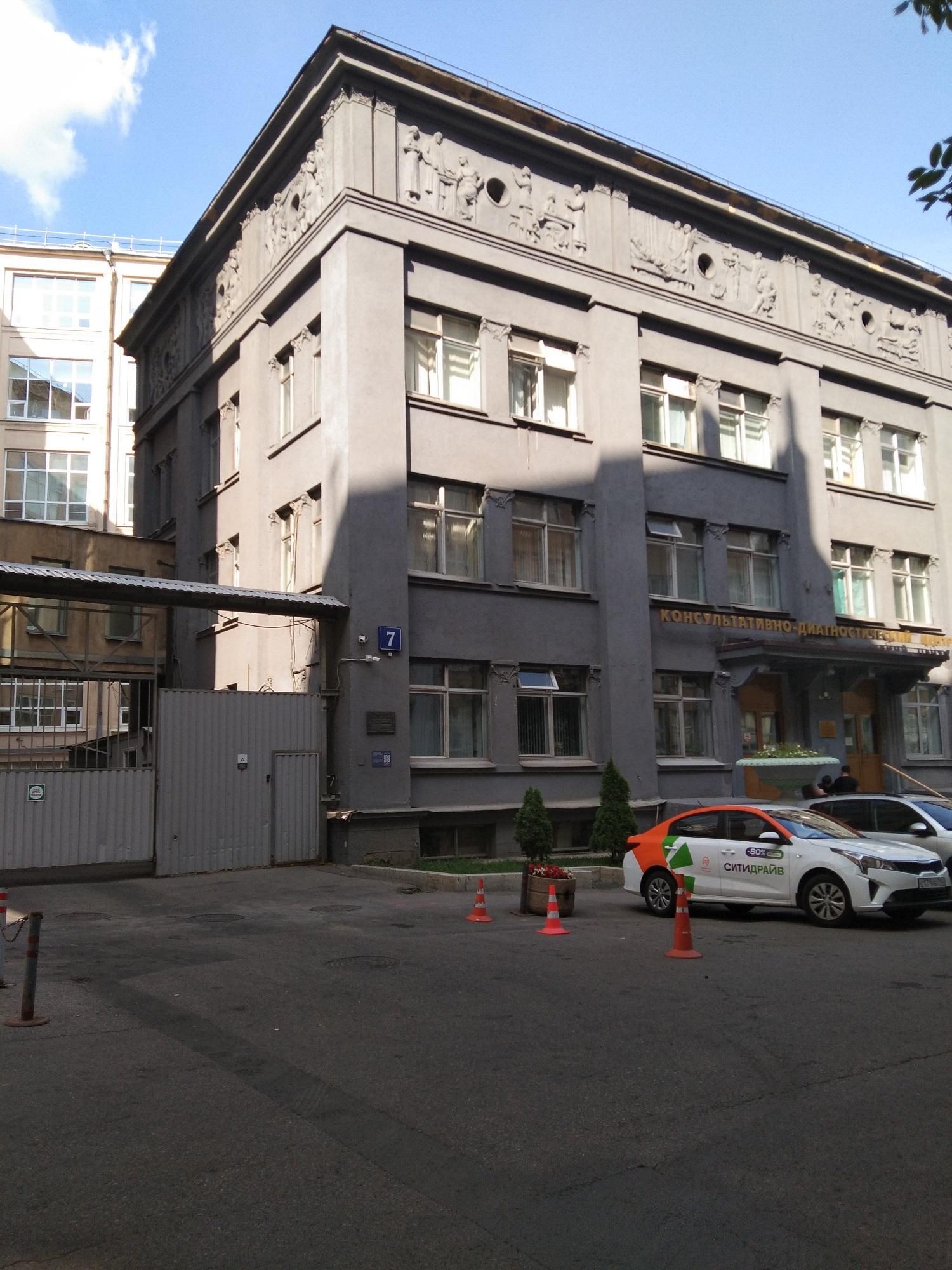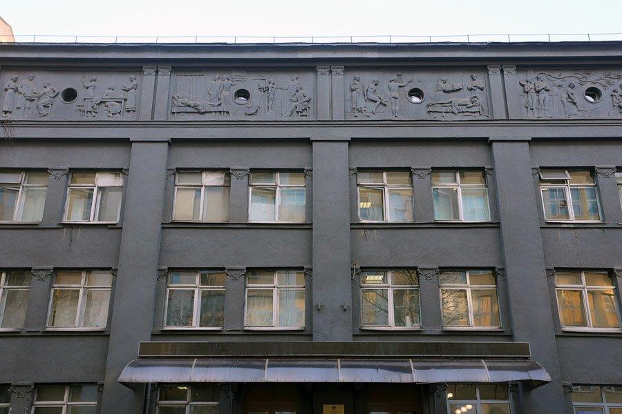 Главным украшением здания стал скульптурный фриз в верхней части строения, решённый в античном стиле. На сайте поликлиники указано: «особую гордость вызывает фасад здания, выполненный выдающимся скульптором ХХ века Верой Игнатьевной Мухиной и украшенный барельефами на медицинскую тематику». Однако по материалам архива РГАЛИ, автором барельефов является не Вера Мухина, а ученик Сергея Конёнкова скульптор Иван Фёдорович Рахманов.