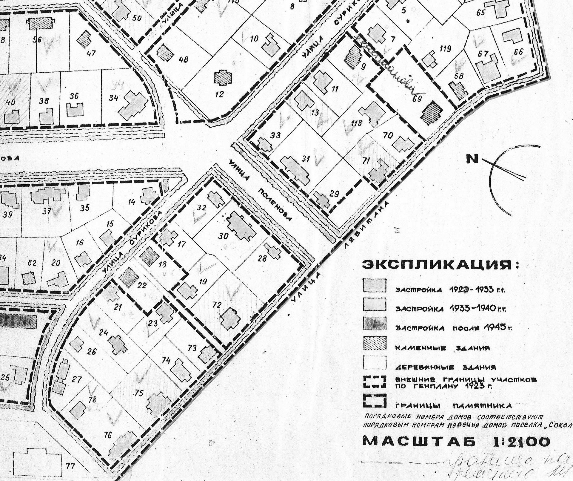 Всего в перечень градостроительного поселка Сокол включено 119 домов, из них 114 построены в период с 1923 по 1931 г. по проектам архитекторов Н. Марковникова, братьев Весниных, И.Кондакова, Н. Дюрнбаума. Они реализовали популярную в то время концепцию города-сада. Все коттеджи поселка Сокол предназначались для использования под жилье, спланированы и построены для односемейного заселения выдающихся представителей профессий: архитекторов, художников, инженеров, учителей, врачей.