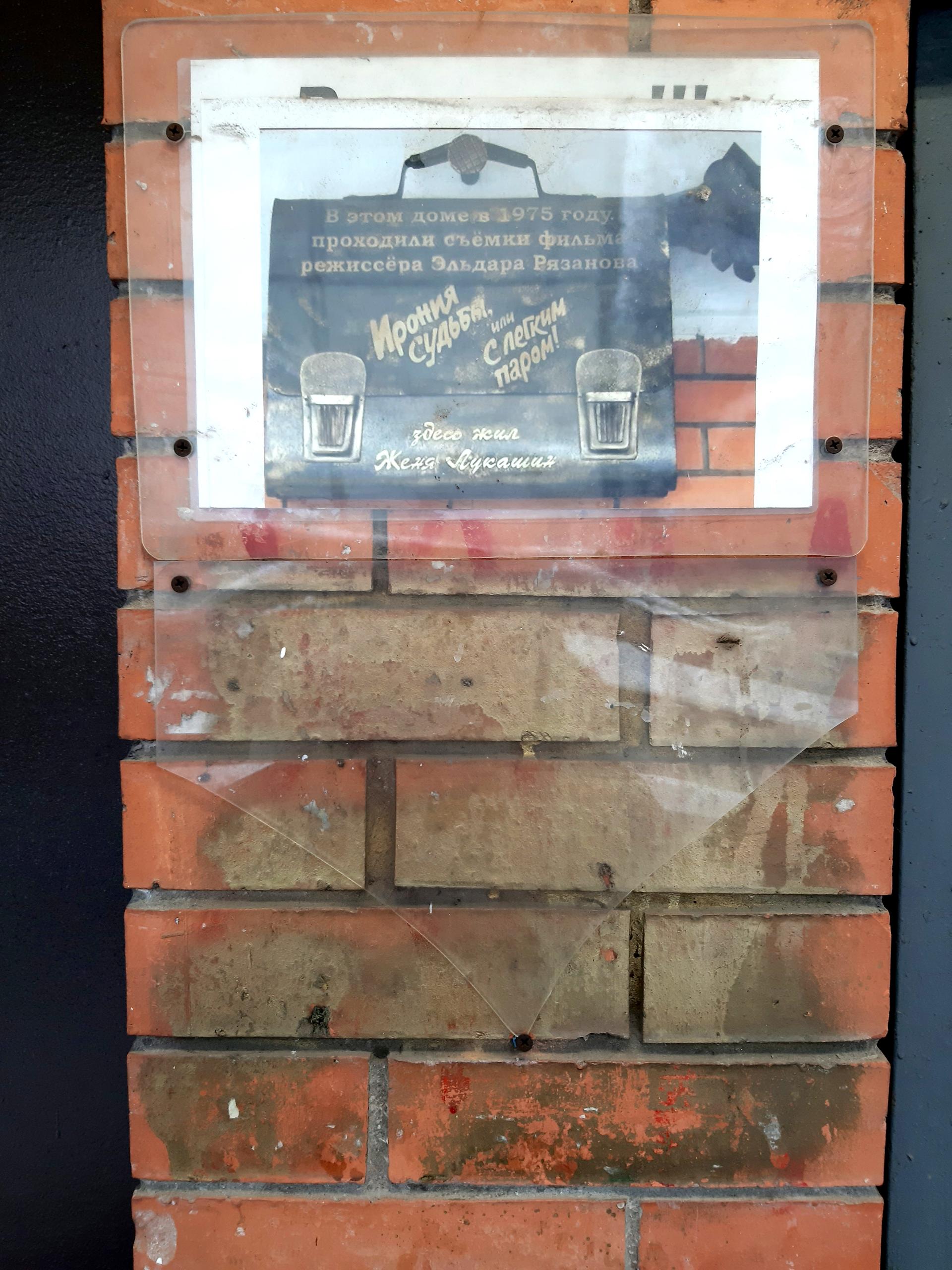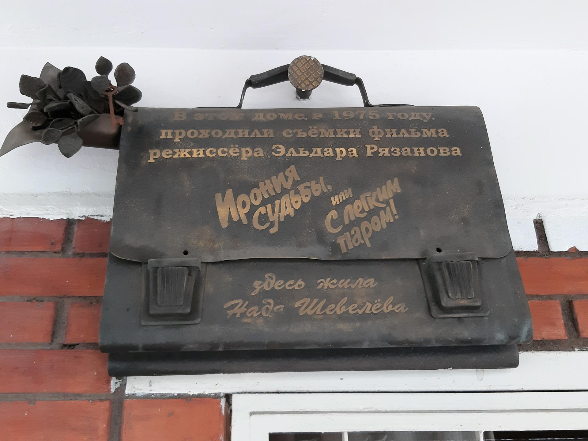 Памятные таблички на зданиях установили 29 декабря 2007 года в присутствии самого Эльдара Рязанова. Они выполнены в виде бронзовых портфелей с торчащими банными вениками. Таблички различаются надписями: на одной указано — «здесь жил Женя Лукашин», на другой — «здесь жила Надя Шевелева».