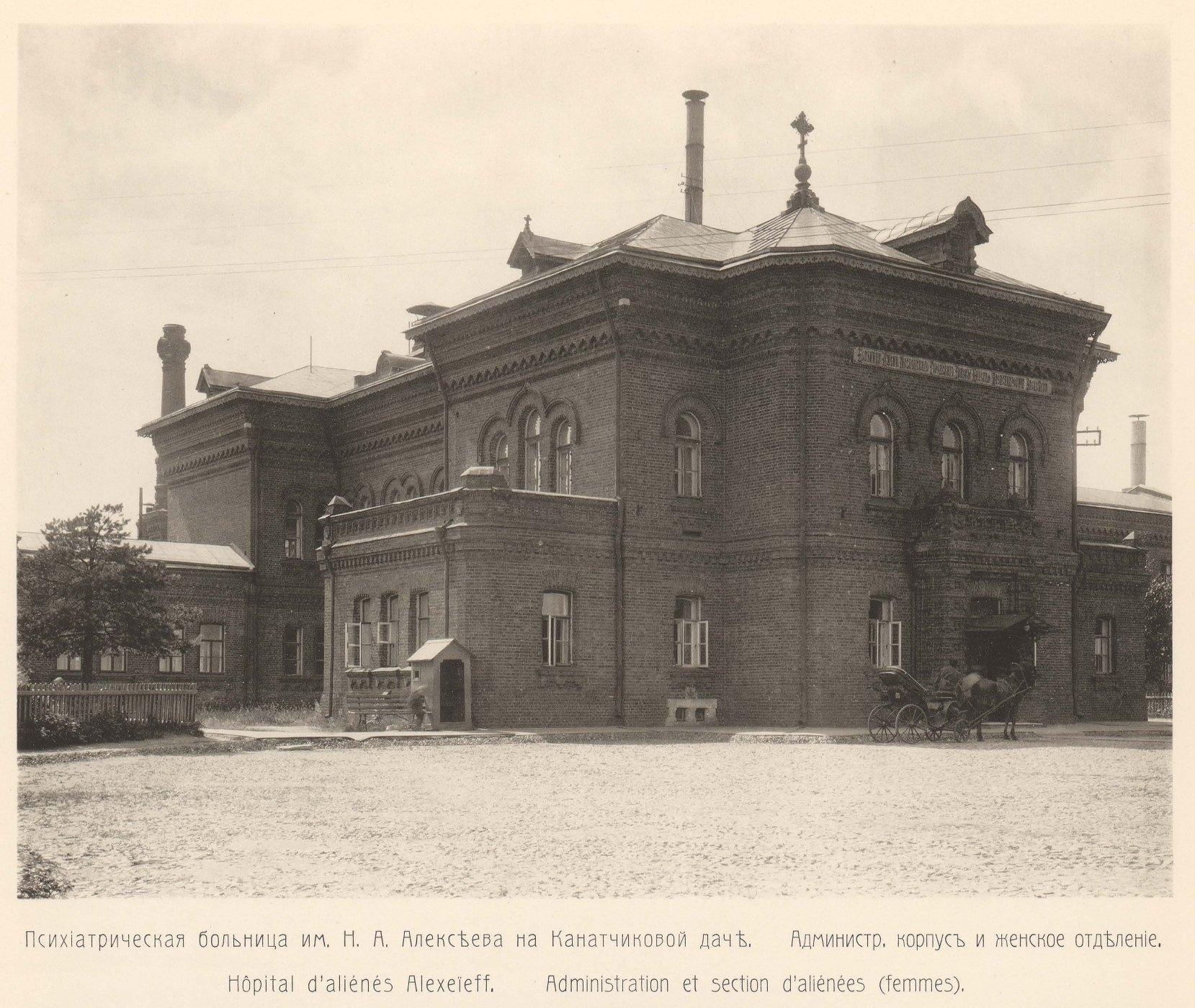 Проект психиатрической лечебницы был составлен Л.О. Васильевым к лету 1890 года. Строительство первой очереди больничного городка происходило в 1890–1894 гг. За ним тщательно следил Н.А. Алексеев, который лично проверял качество кирпича: брал один из каждой партии и кидал об пол. Если кирпич ломался, всю партию браковали. 12 мая 1894 года состоялось освящение и торжественное открытие больницы, получившей имя Н.А. Алексеева. Больничные здания, расположенные симметрично относительно центрального корпуса с церковью, формировали две половины лечебницы – мужскую и женскую. В каждой было отделение для вновь поступавших больных, в котором, помимо общих спален на 6-8 человек, имелось пять одиночных комнат.