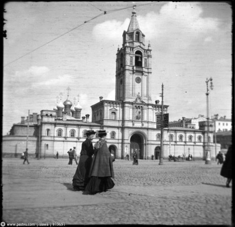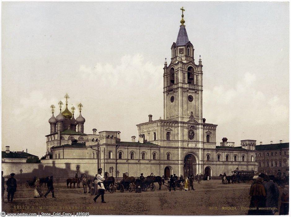 До середины XVII столетия никакой площади здесь не было, а был просто плацдарм перед воротами Белого города. В 1641 году на этом месте москвичи встречали чудотворную икону Страстной Богоматери, принесенную из Нижнего Новгорода. Через пять лет, в память об этом событии, под крепостной стеной был возведен стройный пятиглавый собор (именно собор, один из девяти, существовавших в Москве в то время), окруженный двухъярусной арочной галереей. В нем и пребывала Страстная икона, одна из почитаемых святынь Дома Романовых.