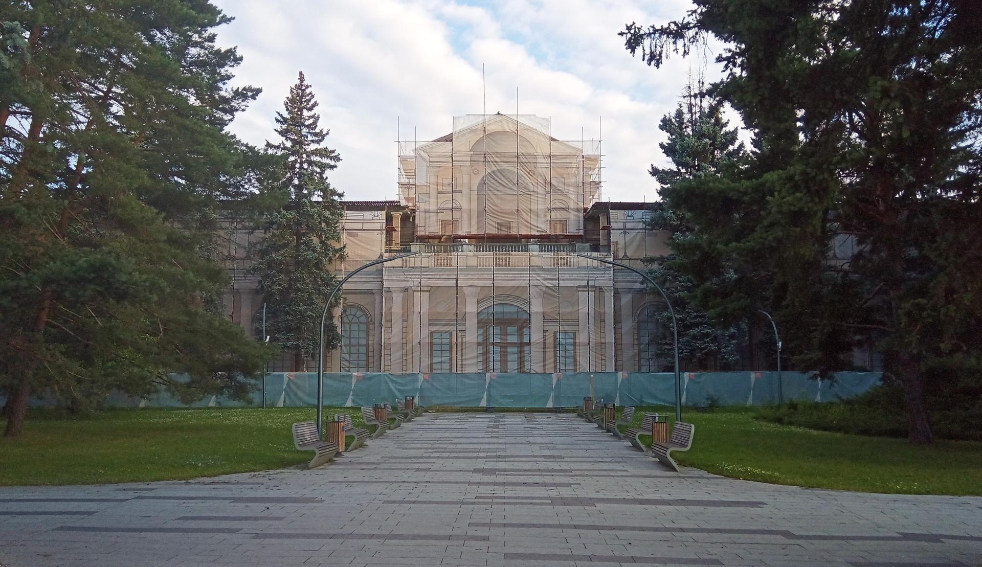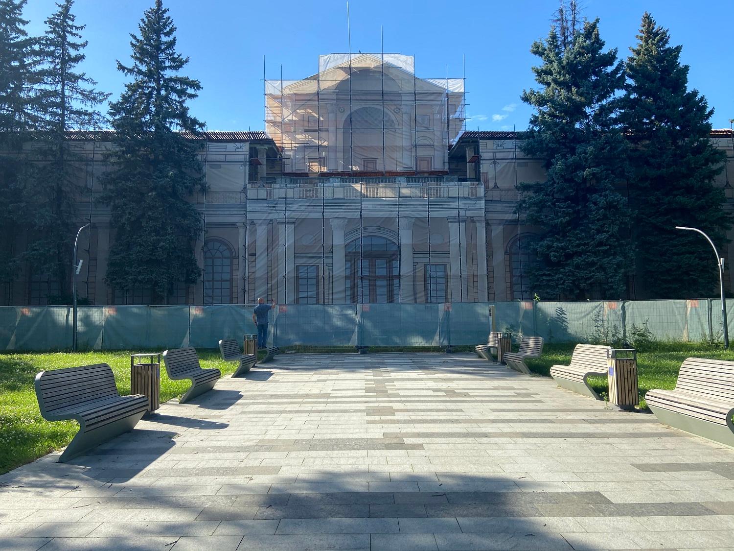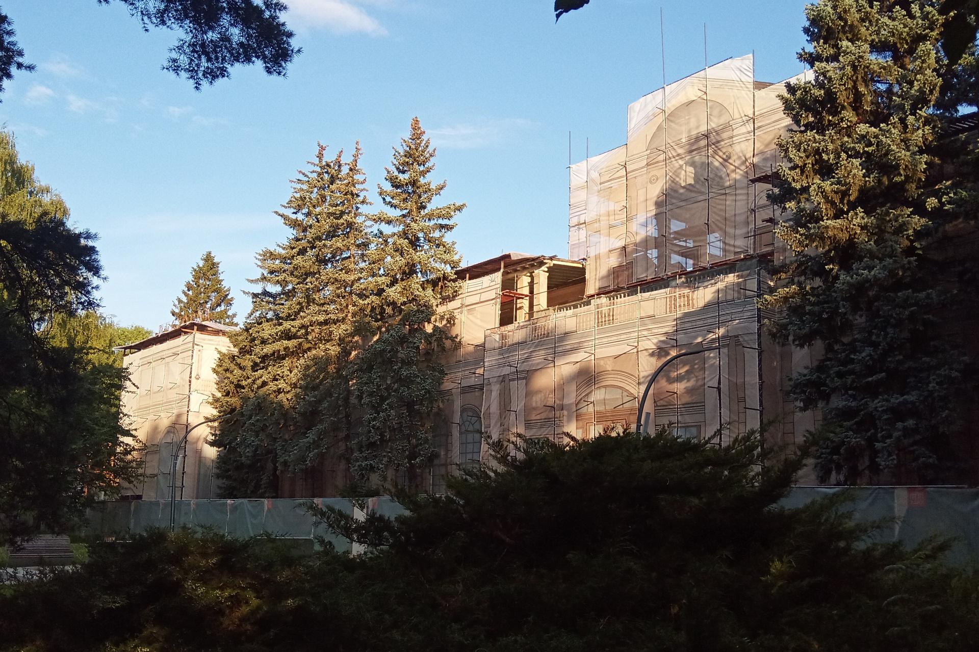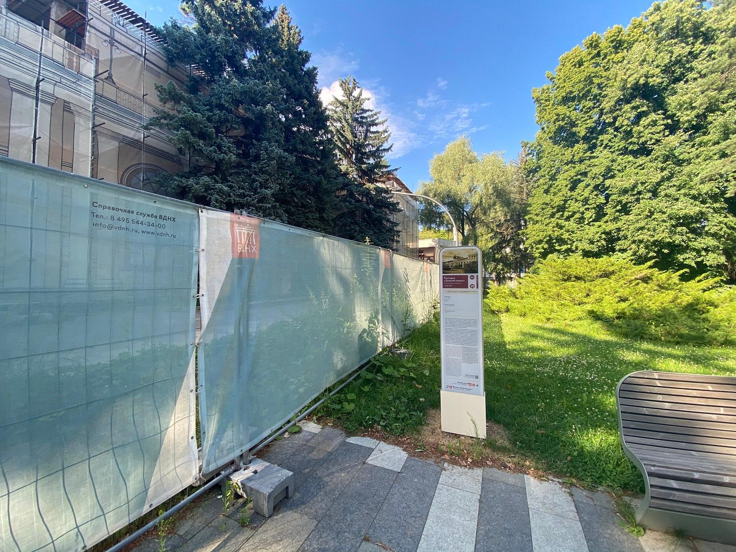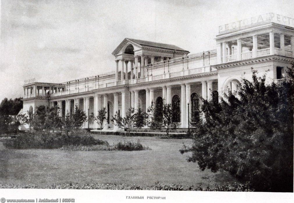 Здание решено в духе римской классики и в отличие от большинства построек ВДНХ лишено ярких национальных черт. Но это и не «сухое» следование канону, здание весьма декоративно — до сих пор многое в убранстве поражает тщательностью прорисовки и богатством исполнения — будто бы это руина эпохи величественных римских императоров. Изначально кусты и деревья не закрывали здание, а в настоящее время заброшенный ресторан почти скрыт пышной зеленью, за которой прячется протяженный объём, прорезанный высокими арочными окнами. Второй ярус образован террасой, которую поддерживают сдвоенные колонны. С обоих концов чуть выделяются два ризалита, а центральный вход акцентирован высоким портиком, увенчанным фронтоном, который в свою очередь прорезан полуциркульной аркой. Арка продолжается цилиндрическим сводом, который заканчивается полукуполом, сохранившим эффектный рисунок кессонов в сине-зелёной гамме. Это же декоративное решение повторяется в отделке купола потолка вестибюля. В настоящее время ресторан ожидает реставрации.