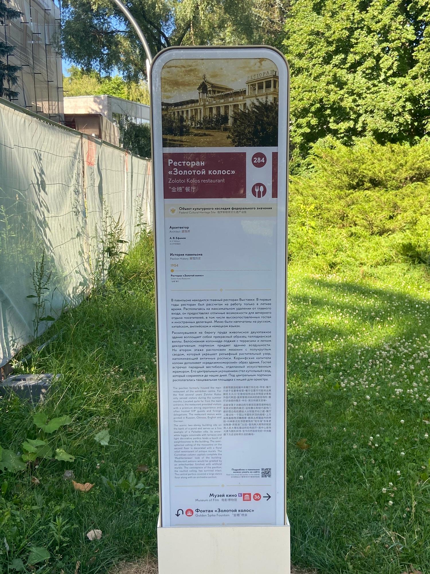Среди почти дюжины капитальных строений, занятых учреждениями общественного питания, самым важным по праву считался ресторан «Золотой колос». Все рестораны, кафе, столовые и даже шашлычные выставки подчинялись Моснарпиту — так же, как и столичные фабрики-кухни. Ресторан был своеобразным финалом в «драматургии» посещения ВДНХ, он расположен в самой удаленной от главного входа, западной, точке выставки, на другом берегу пруда (по центру которого находится одноименный фонтан), экскурсионные группы «Интуриста» неизменно обедали здесь. Будучи одним из крупнейших ресторанов столицы, «Золотой колос» вмещал 1000 гостей. С террас второго этажа открываются виды не только на природно-парковый комплекс западной части выставки, но и фонтан, и монументальные павильоны «Главмясо» и «Механизация» («Космос»), ресторан «Лето».
