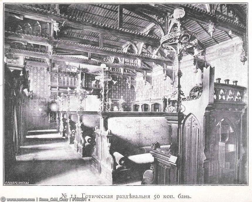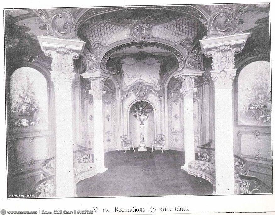 «В них так и хлынула Москва, особенно в мужское и женское «дворянское» отделение, устроенное с неслыханными до этого в Москве удобствами: с раздевальной зеркальной залой, с чистыми простынями на мягких диванах, вышколенной прислугой, опытными банщиками и банщицами. Раздевальная зала сделалась клубом, где встречалось самое разнообразное общество, — каждый находил здесь свой кружок знакомых, и притом буфет со всевозможными напитками, от кваса до шампанского Моэт и Аи. В этих банях перебывала и грибоедовская, и пушкинская Москва, та, которая собиралась в салоне Зинаиды Волконской и в Английском клубе», - вспоминал в своей книге «Москва и москвичи» Владимир Алексеевич Гиляровский.