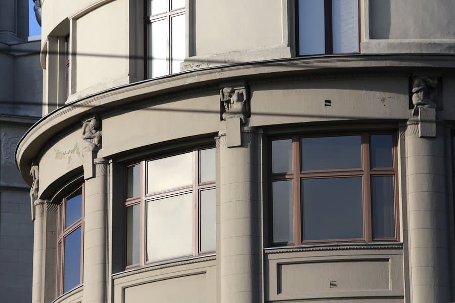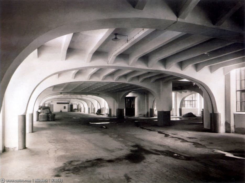 Огромные квадратные окна контор здания с ротондой, выходившего на Новую площадь, устройство подвального этажа, образующего «улицу» с эллипсовидными железобетонными арками, — архитектура во многом была новаторской. Купольное завершение ротонды было окружено несколькими поясами окон. Верхний пояс образовывали полукруглые окна, за ними шел пояс, сочетающий окна и барельефы, не сохранившиеся до наших дней. Пояса поддерживал карниз на вертикальных пилястрах, которые заканчиваются небольшими прямоугольными нишами с коленопреклоненными мужскими и женскими фигурами. Такие же ниши идут на протяжении всего фасада здания, выходящего на площадь.