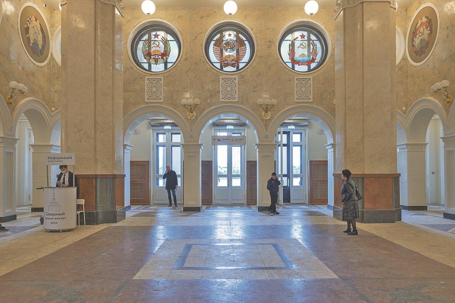 В интерьерах вокзала были отреставрированы потолки, стены и декоративные элементы, включая гризайль, роспись по стеклу, вентиляционные решётки и панно на холстах. Восстановлены знаменитые панно с изображениями шлюзов канала имени Москвы и витражи с гербами советских республик.