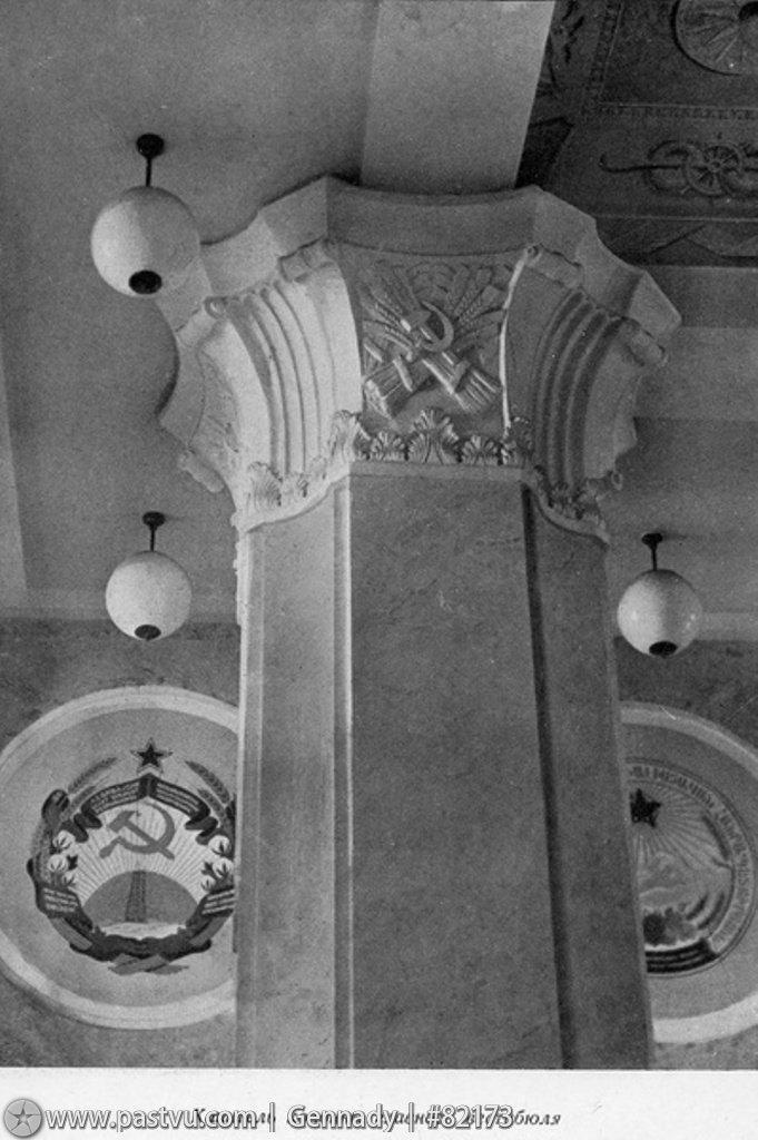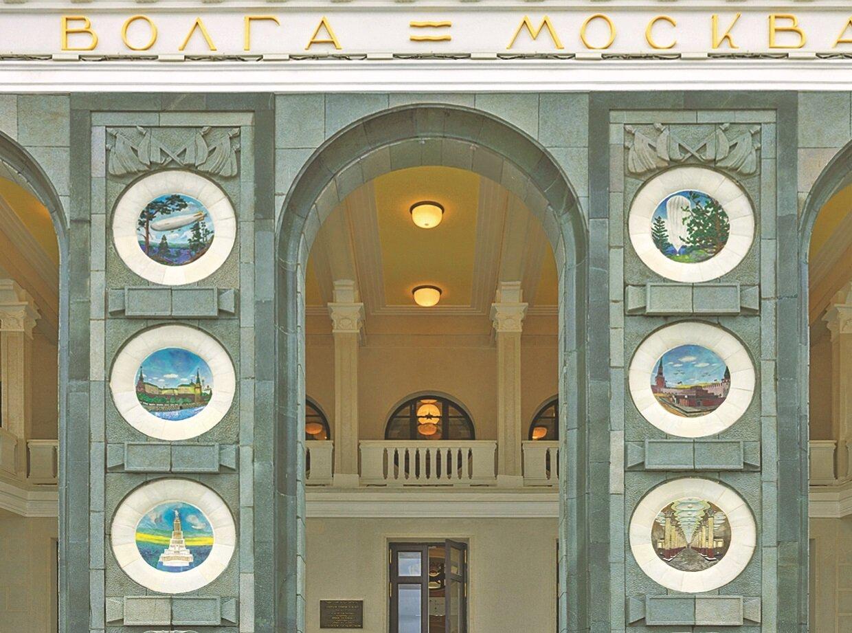 Внутреннее убранство вокзала не уступало по роскоши его внешнему облику. Здесь были открыты первоклассный ресторан, комфортабельные залы ожидания, а интерьеры украшали произведения монументального искусства. Особого внимания заслуживают знаменитые панно с изображениями девяти шлюзов канала имени Москвы, а также панно и витражи с государственными гербами советских республик.