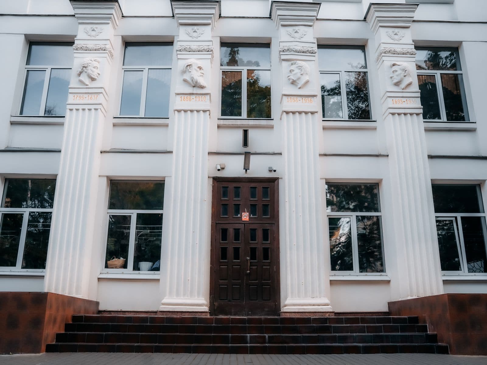 Во внешнем облике школа напоминала предыдущие проекты, однако имела свои отличительные черты. Входы — три парадные двери — были сосредоточены в центре главного фасада. Между ними на высоту двух этажей поднимались пилоны, украшенные рельефными портретами классиков русской литературы: А. С. Пушкина, Л. Н. Толстого, А. М. Горького и В. В. Маяковского. Аналогичный приём был использован ранее в проекте школы архитектора Л. А. Степановой, где в числе классиков также присутствовал Толстой.