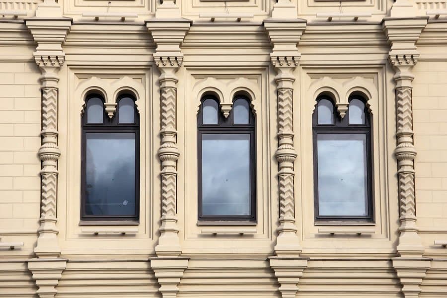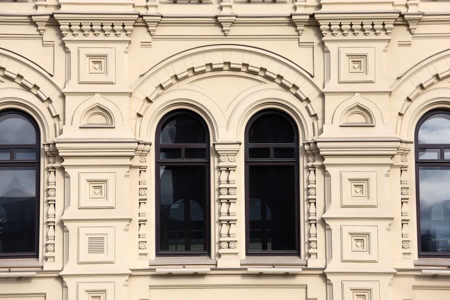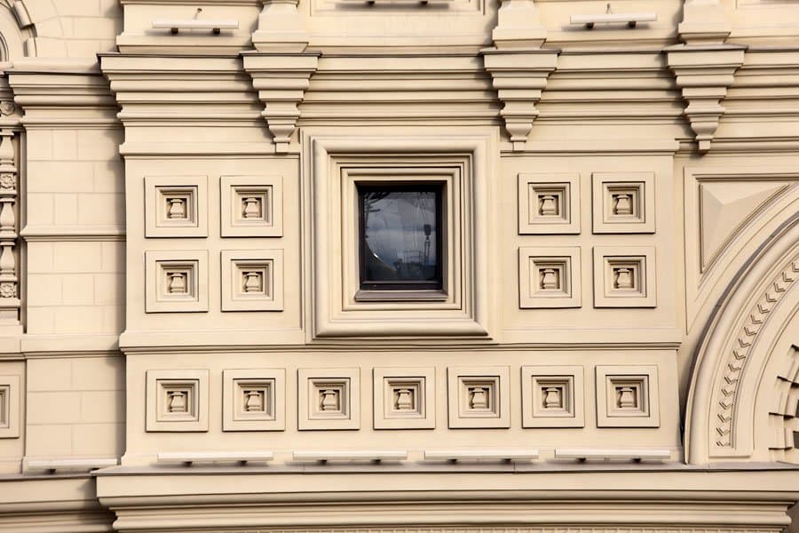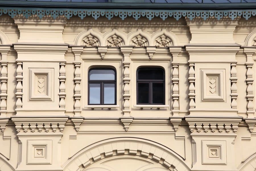 Средние торговые ряды состояли из нескольких зданий: главного (по периметру всего квартала) «кольцевого» корпуса и четырёх двухэтажных внутренних корпусов, образовывавших целый квартал с маленькими улочками. Фасад внешнего корпуса состоит из двух разновысоких частей (поскольку здание стоит на спуске к Москве-реке). Первый этаж выполнен в виде ряда полукруглых арок, над каждой из которых на втором этаже расположены два окна, обрамлённые аркой. Окна третьего этажа украшены наличниками. В целом здание оформлено в «псевдорусском» стиле с большим количеством декоративных деталей.