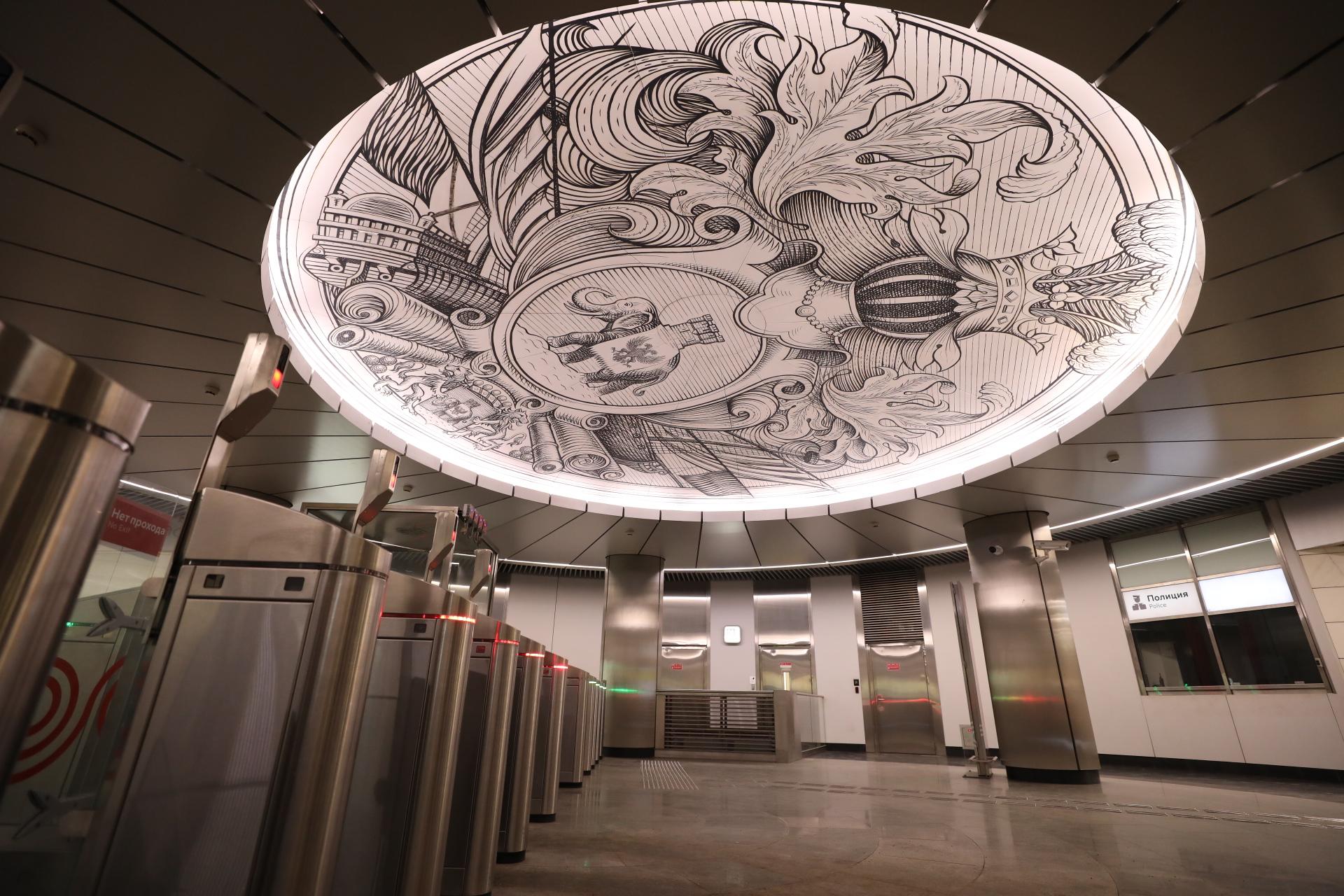 Так, в одном из залов станции разместилась художественная композиция, посвященная первому владельцу дворца – ближайшему сподвижнику и советнику Петра I, Францу Яковлевичу Лефорту. Композицию дополнили геральдические символы фамильного герба: слон и рыцарский шлем. Диаметр изображения составил около 5 метров.