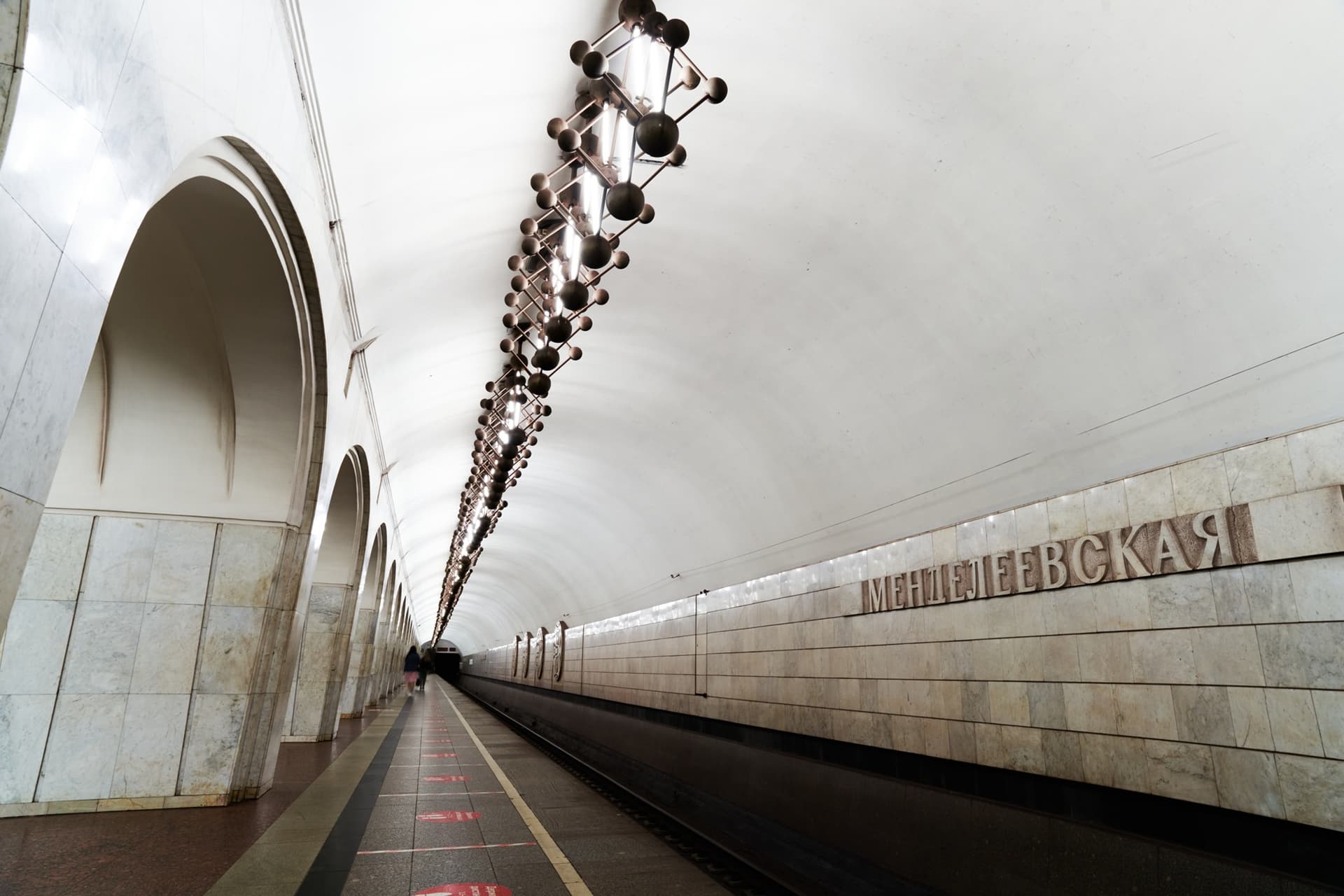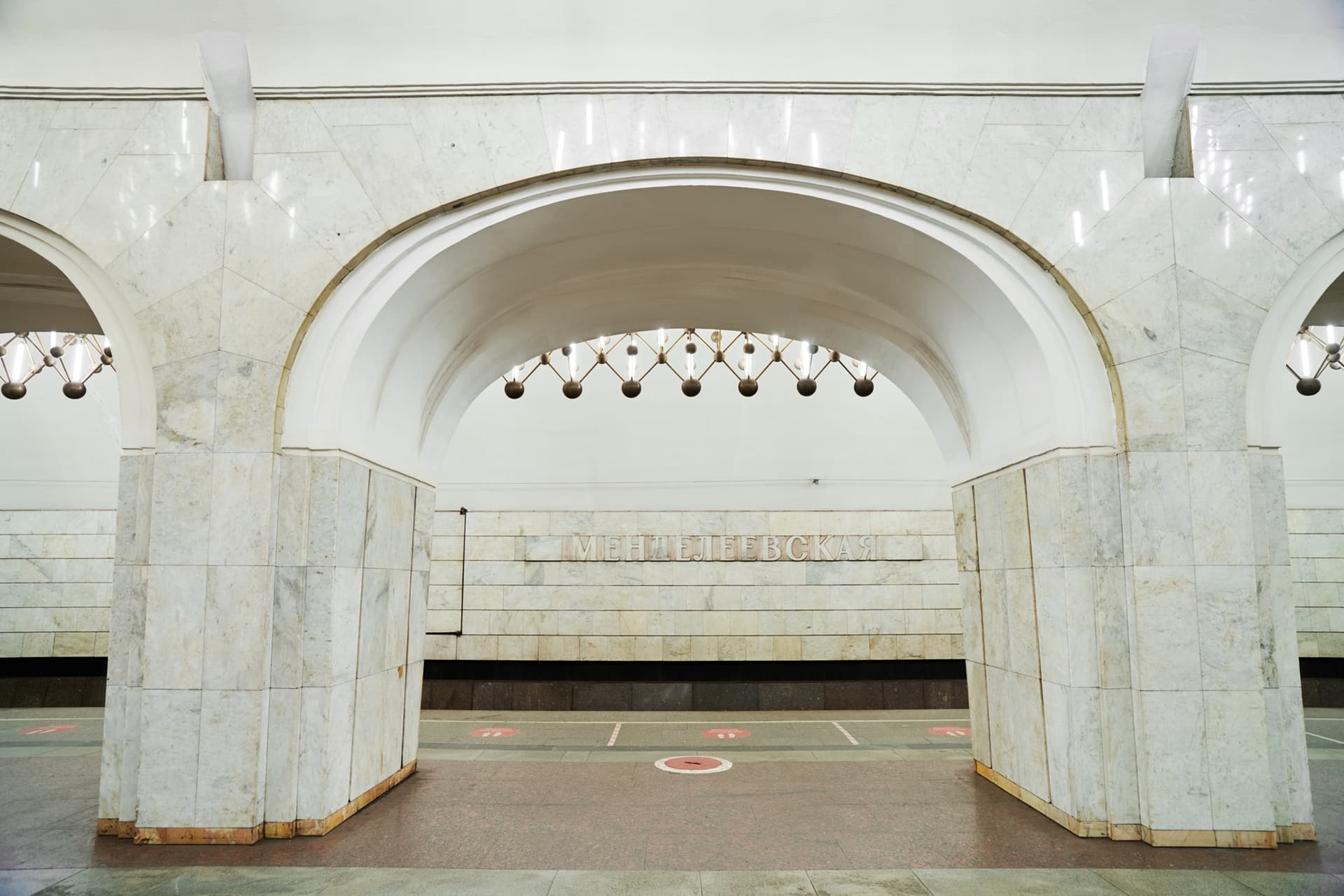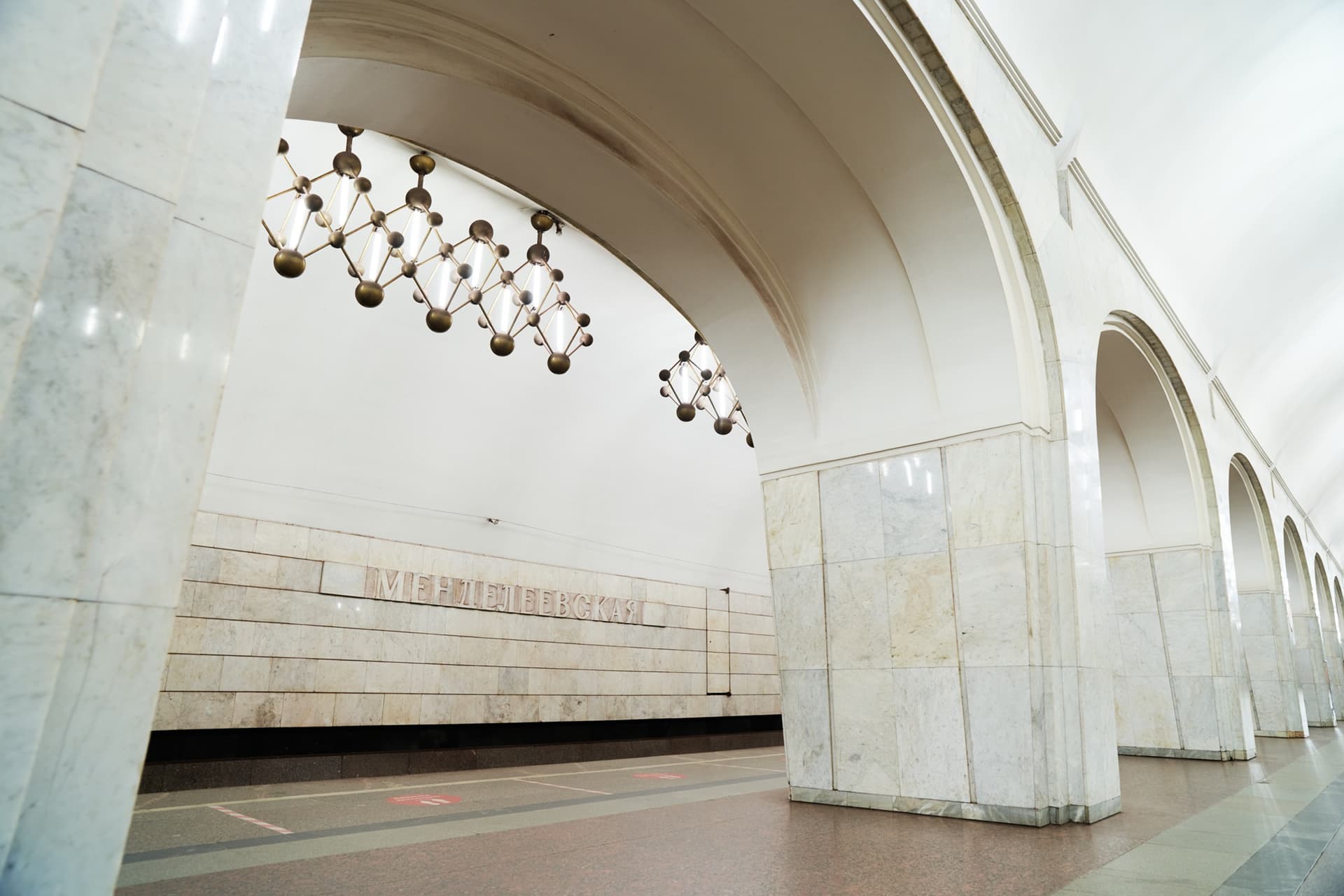 Важную роль в облике станции играют и светильники индивидуального исполнения. Они размещены как над центральным залом, так и в боковых сводах. В этом решении свет не отделен от архитектуры: он становится ее частью, участвует в организации пространства и подчеркивает общий характер станции. За счет этого «Менделеевская» воспринимается как стройное и законченное сооружение.