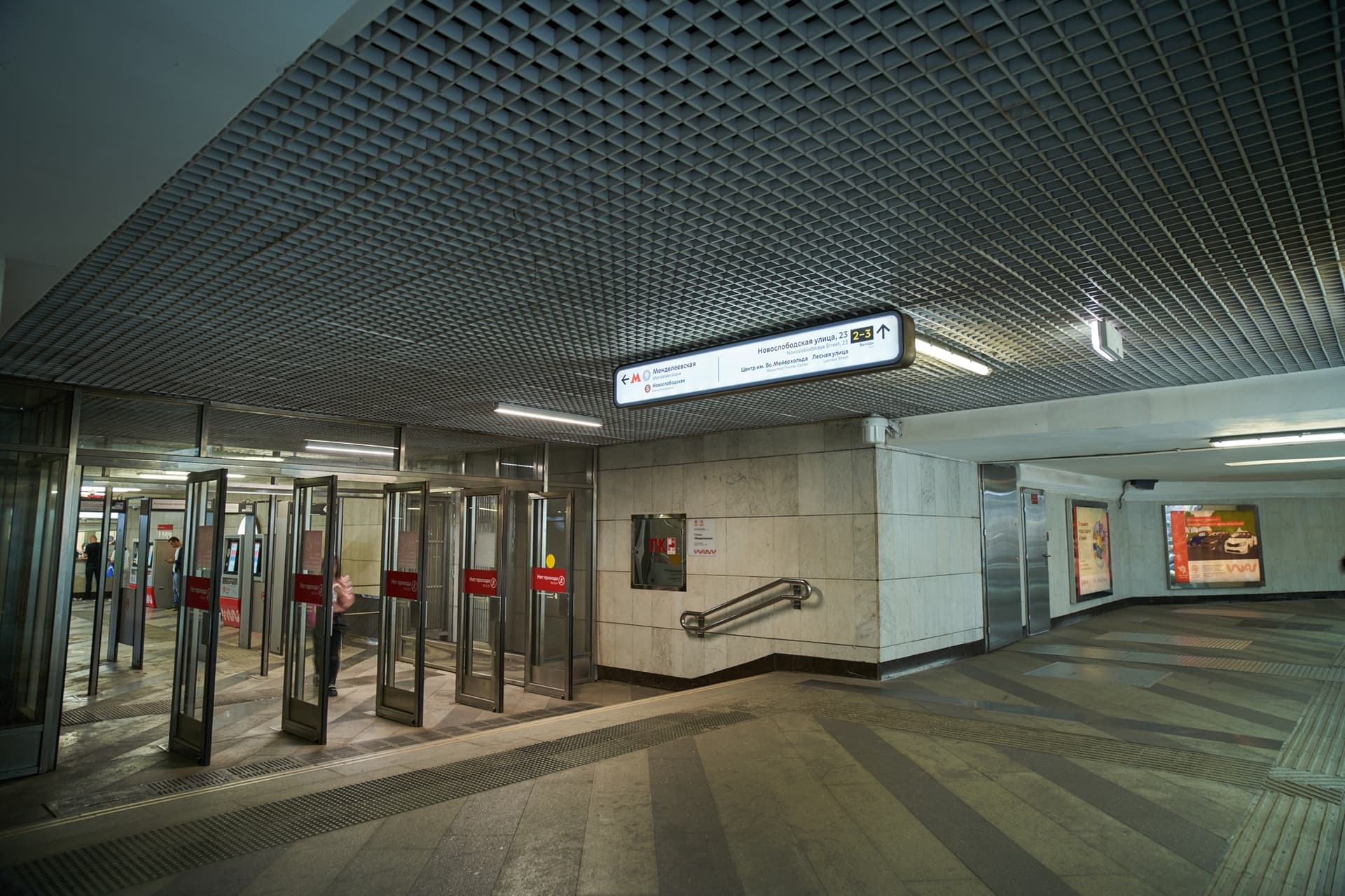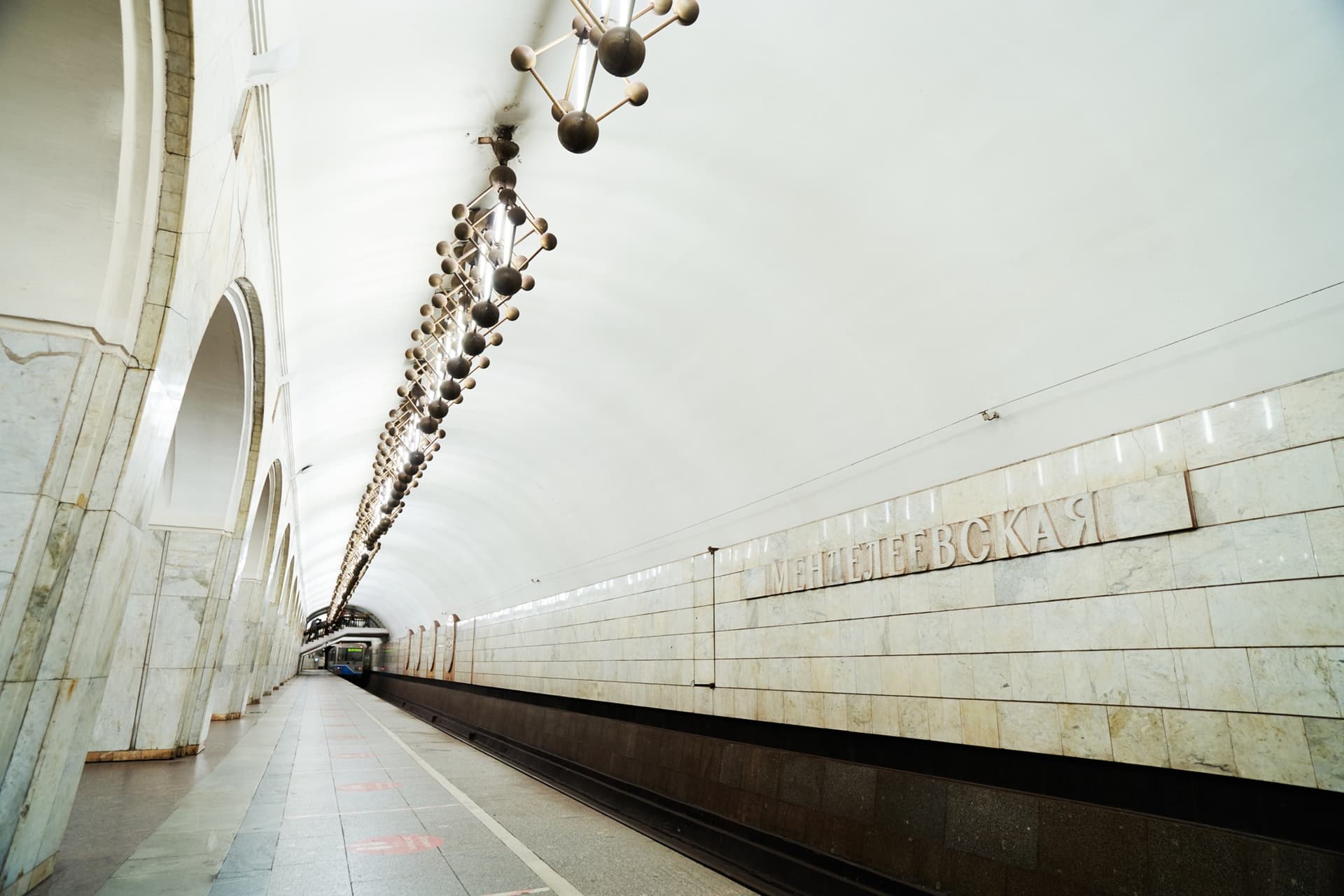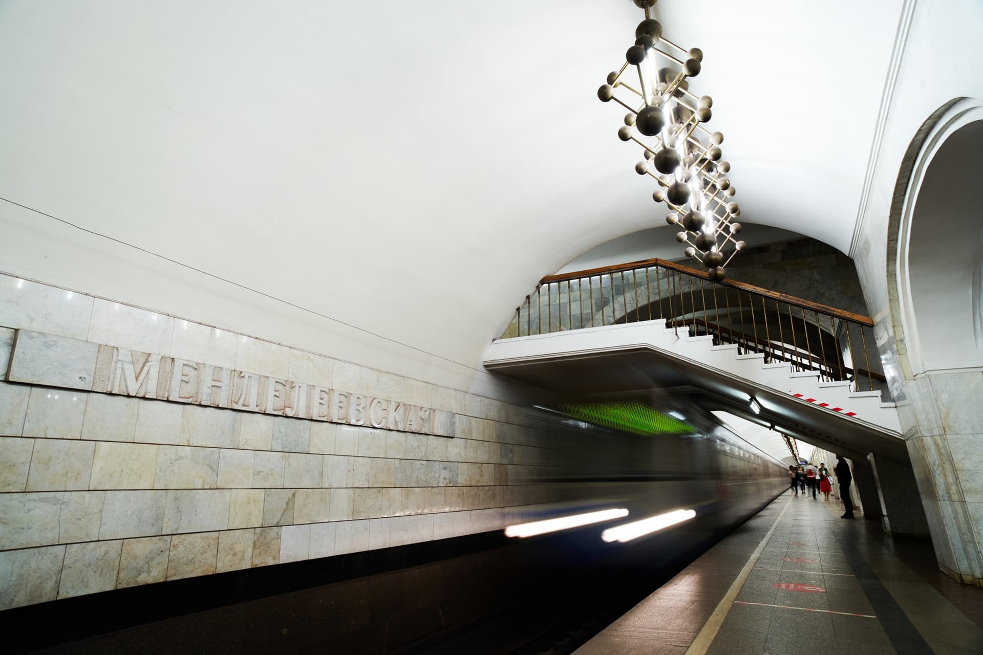 Важную роль в облике станции играют и светильники индивидуального исполнения. Они размещены как над центральным залом, так и в боковых сводах. В этом решении свет не отделен от архитектуры: он становится ее частью, участвует в организации пространства и подчеркивает общий характер станции. За счет этого «Менделеевская» воспринимается как стройное и законченное сооружение.