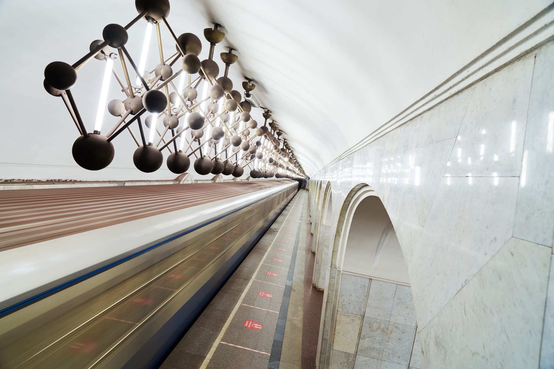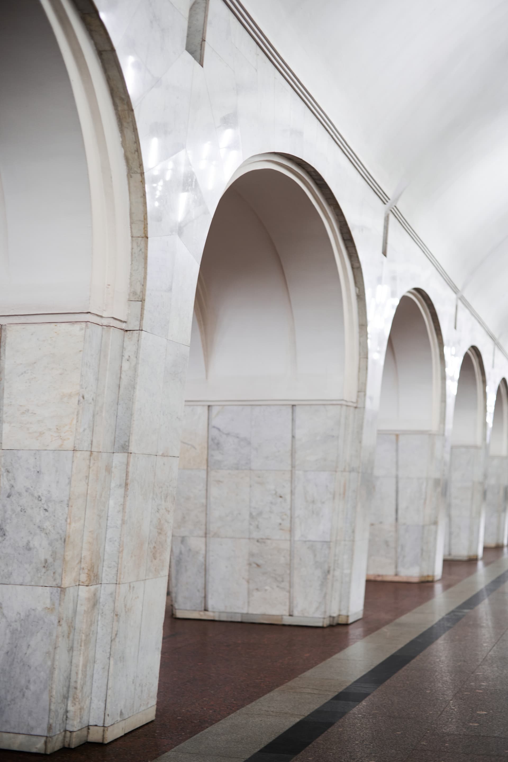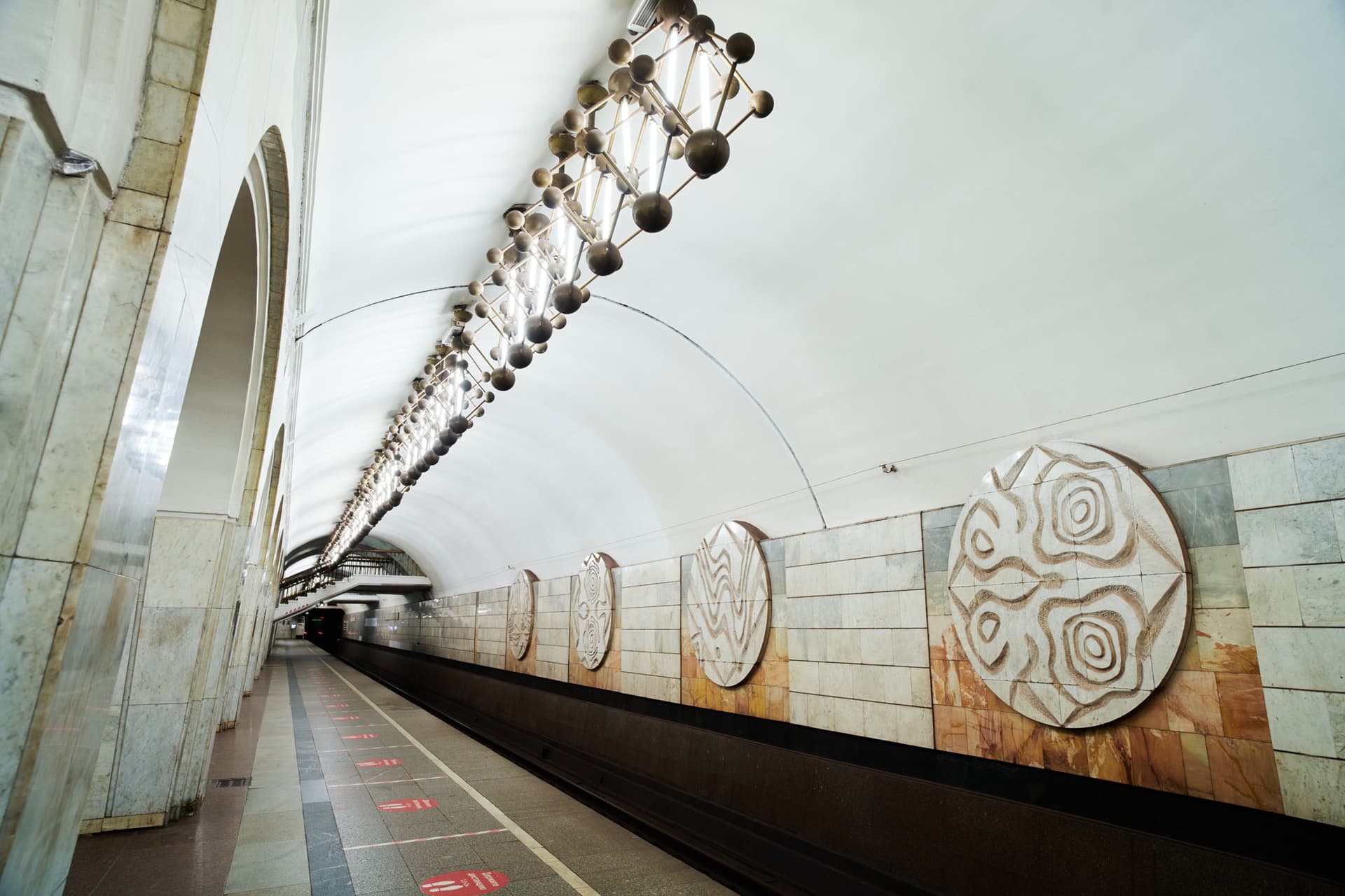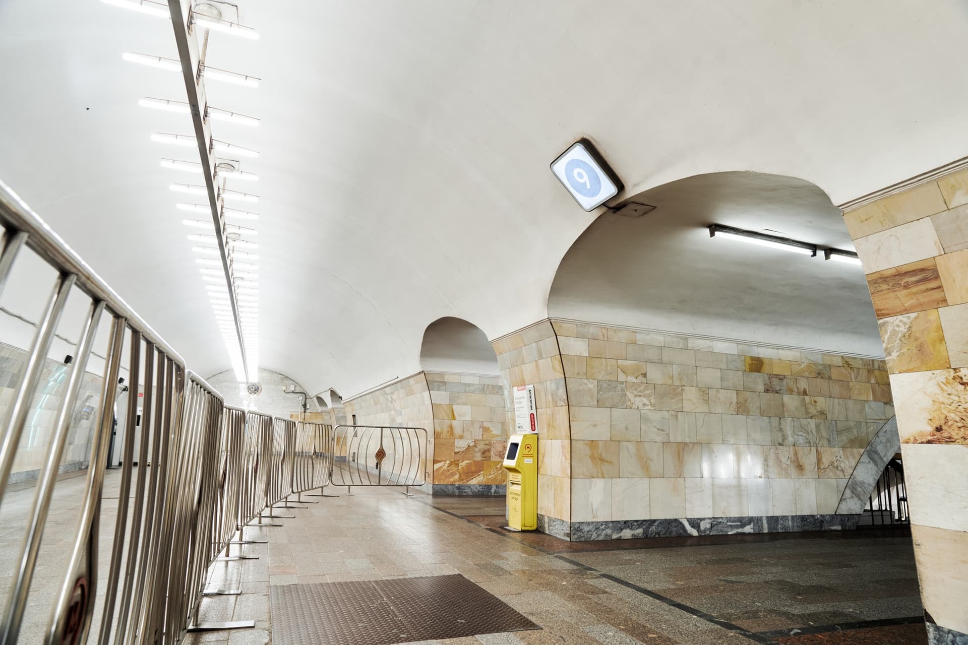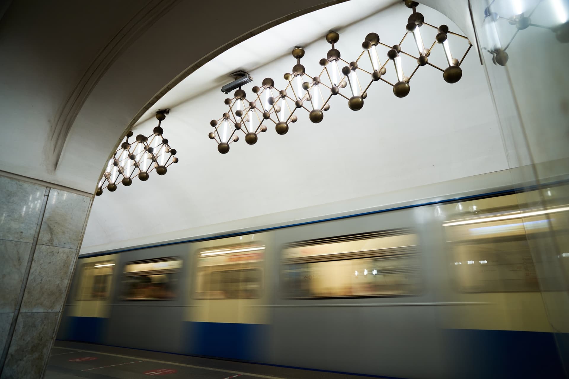 По конструкции это пилонная трехсводчатая станция глубокого заложения. Ее своды опираются на колонны через фасонные клинчатые перемычки. Такое решение определяет и пространственное восприятие станции: центральный зал строится на четком ритме арок и проходов, а сама архитектура не отделена от инженерной схемы, а вырастает из нее.