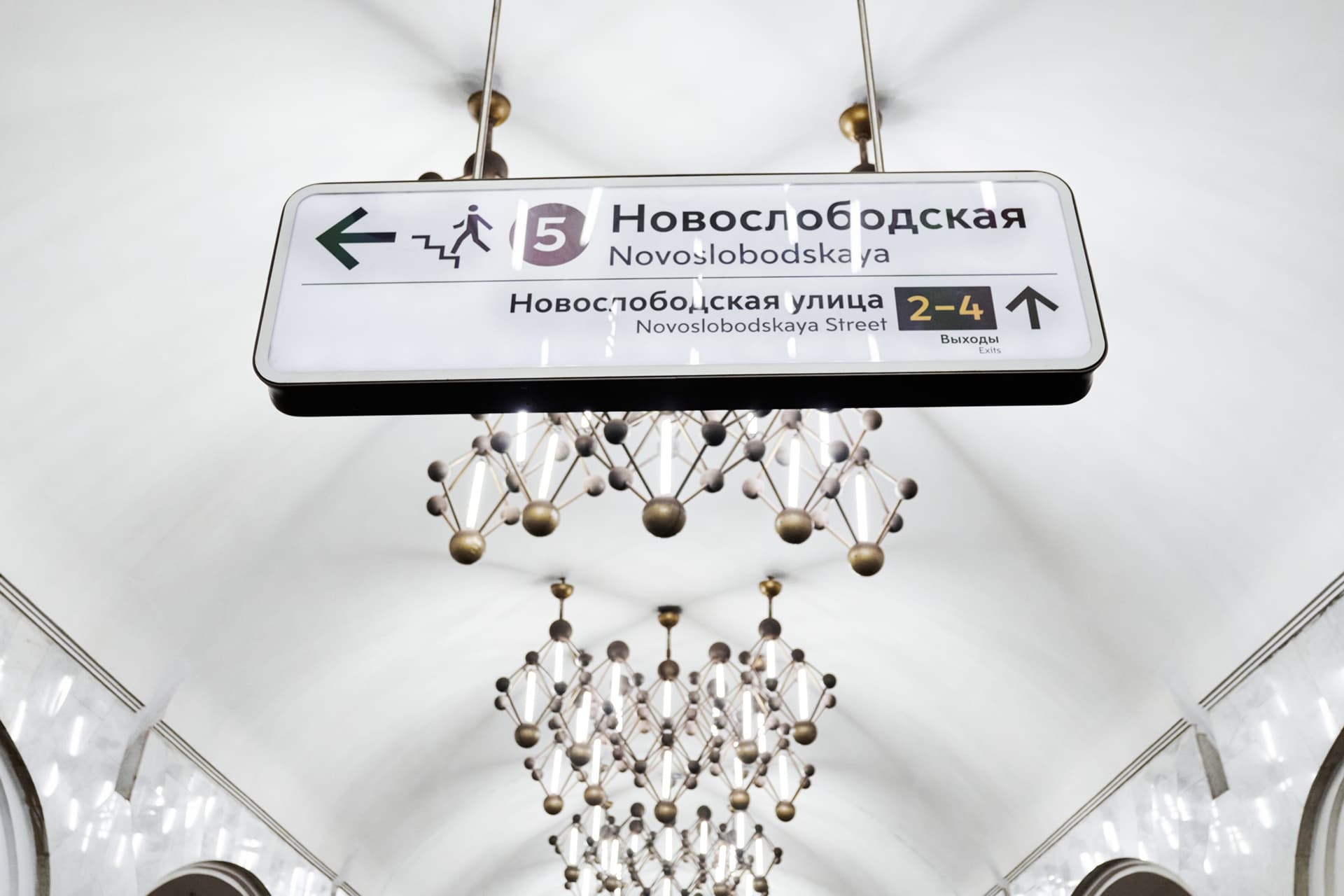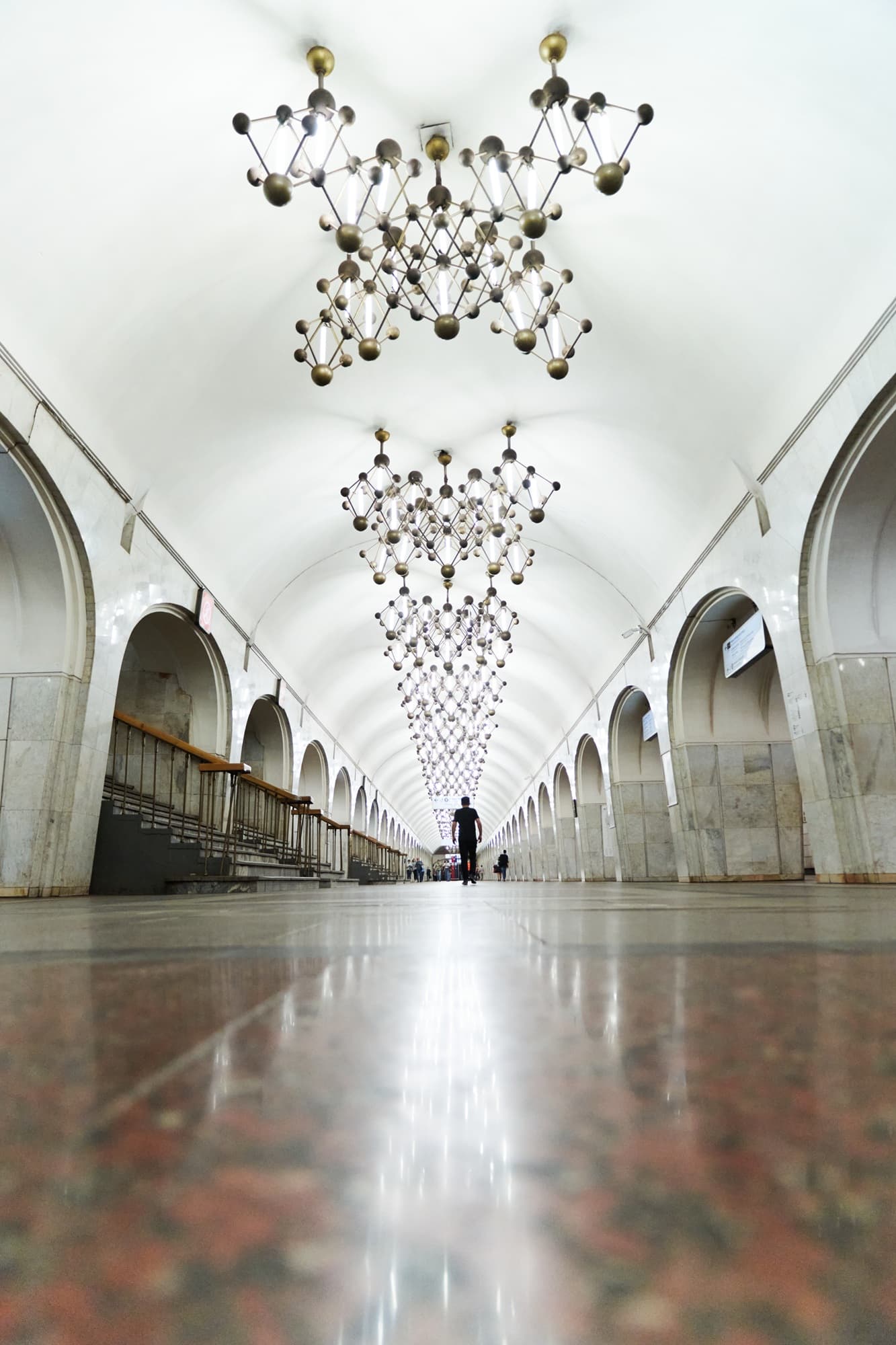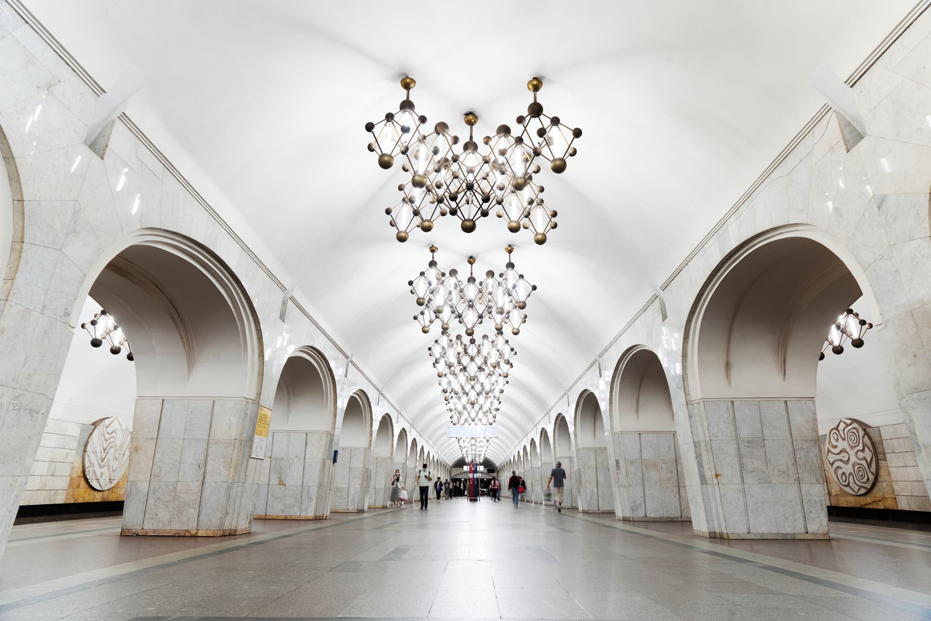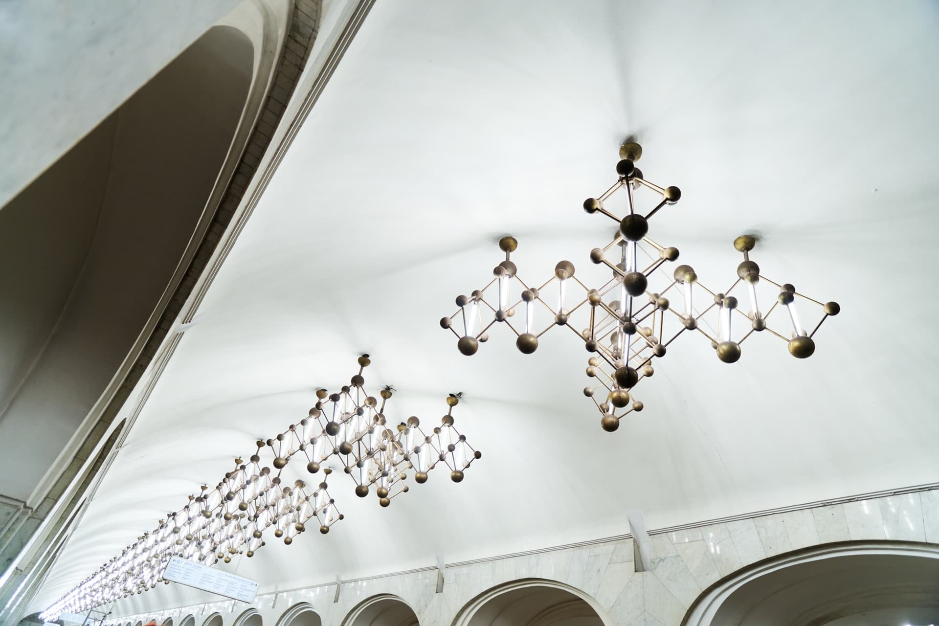 Ту же тему продолжают светильники, форма которых отсылает к кристаллической решетке. Благодаря этому оформление станции выстроено последовательно и подчинено единому замыслу.
