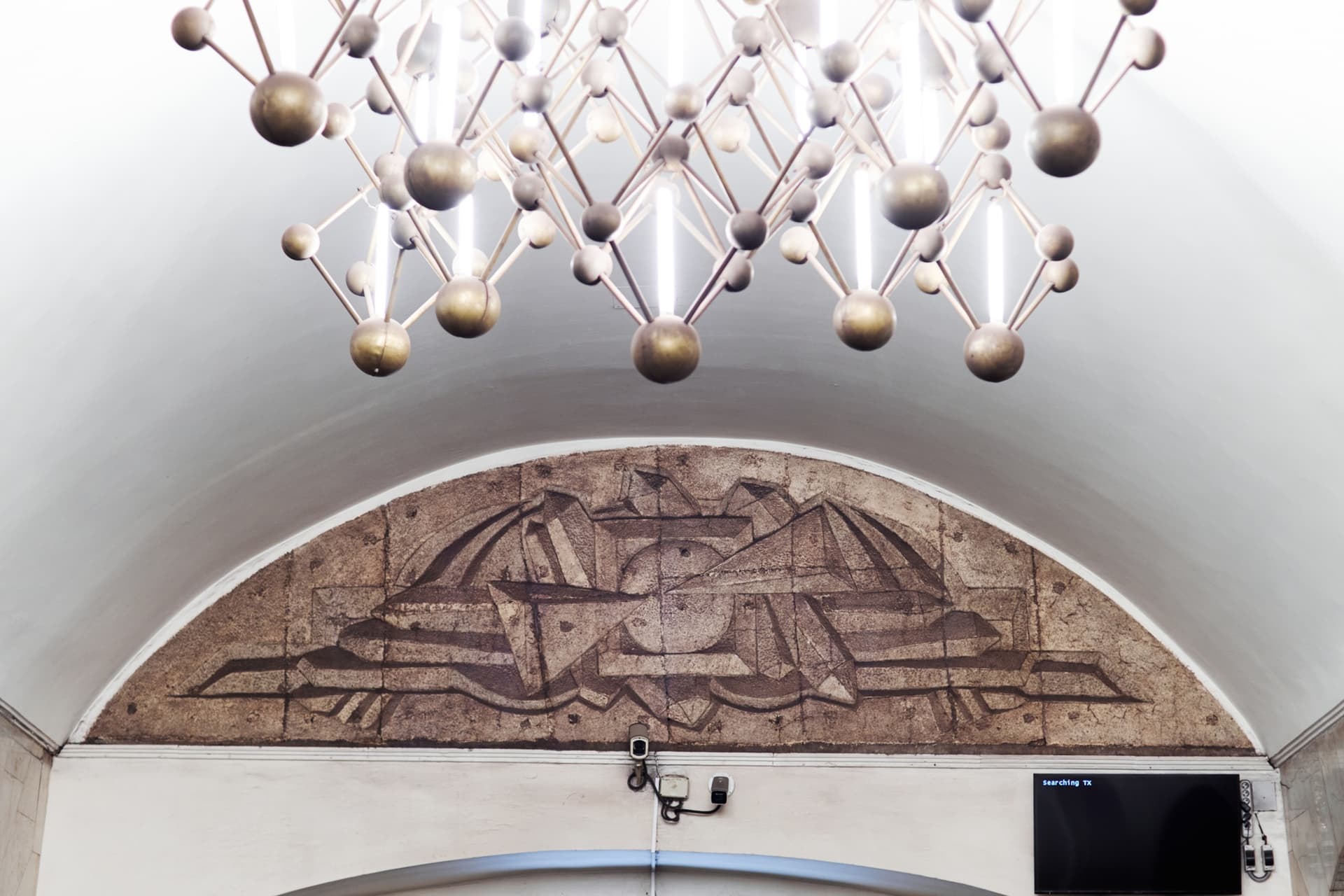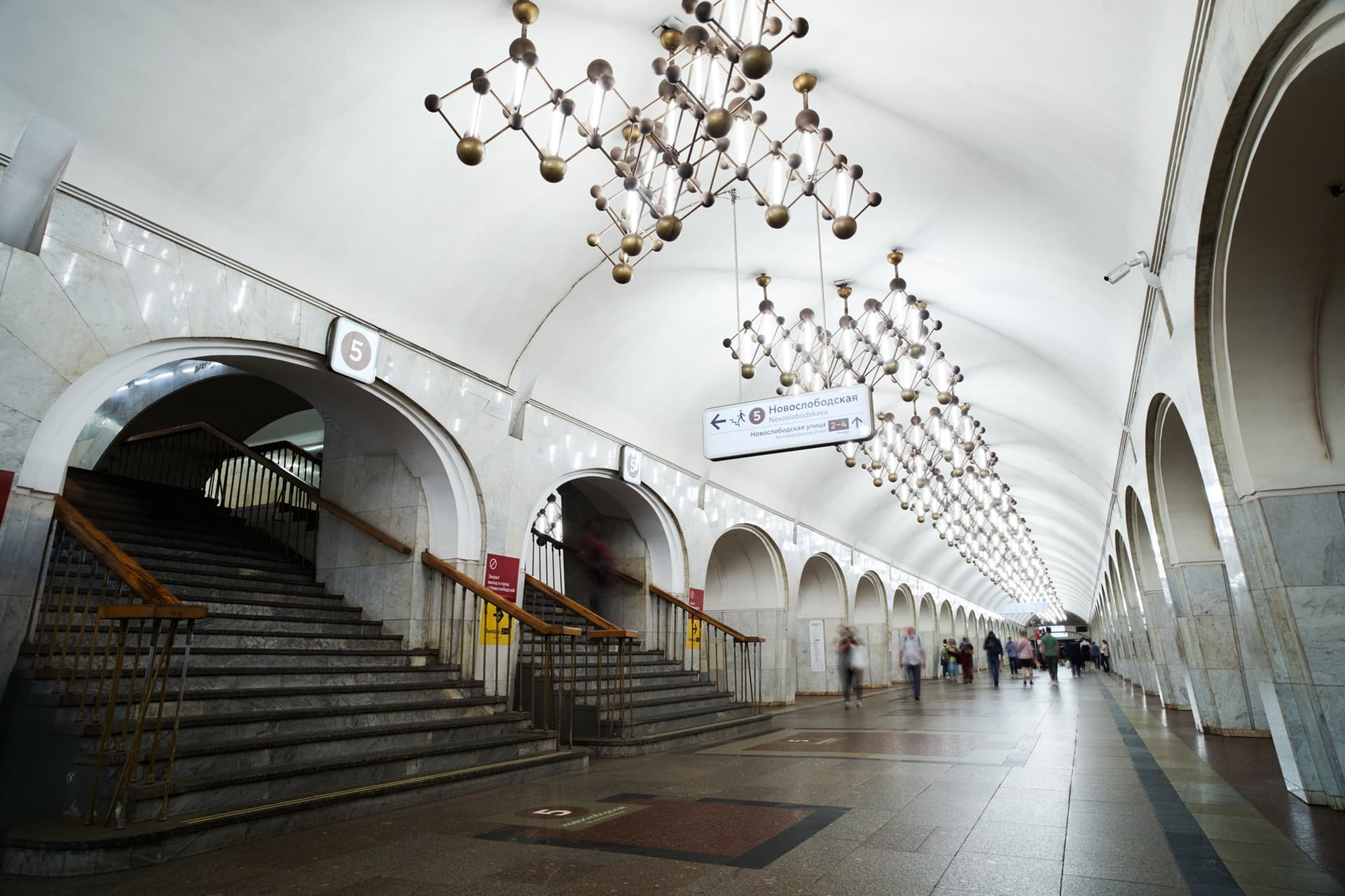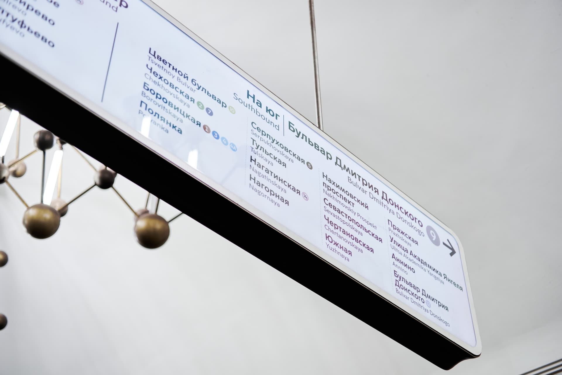 Ту же тему продолжают светильники, форма которых отсылает к кристаллической решетке. Благодаря этому оформление станции выстроено последовательно и подчинено единому замыслу.