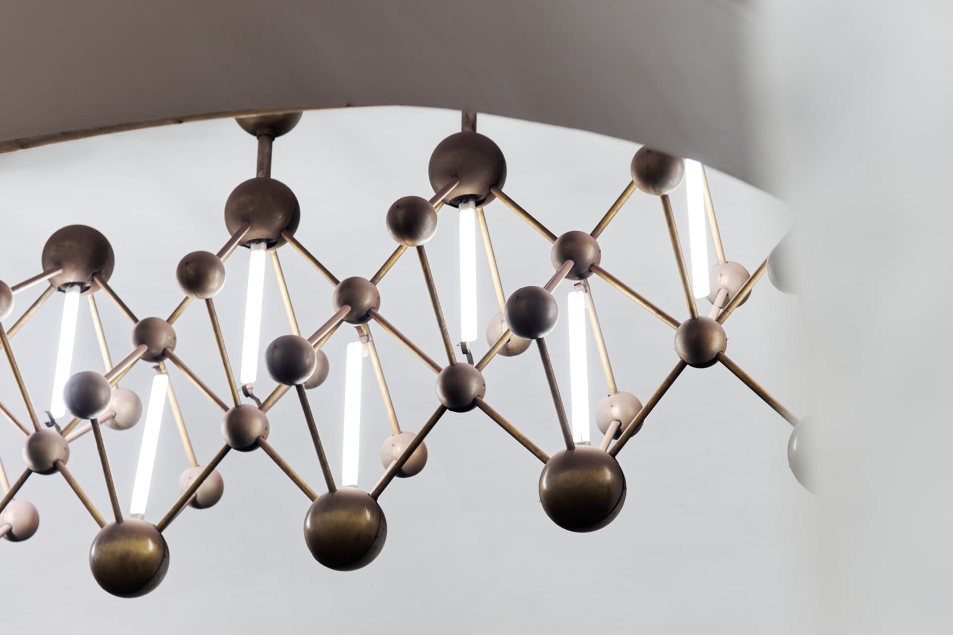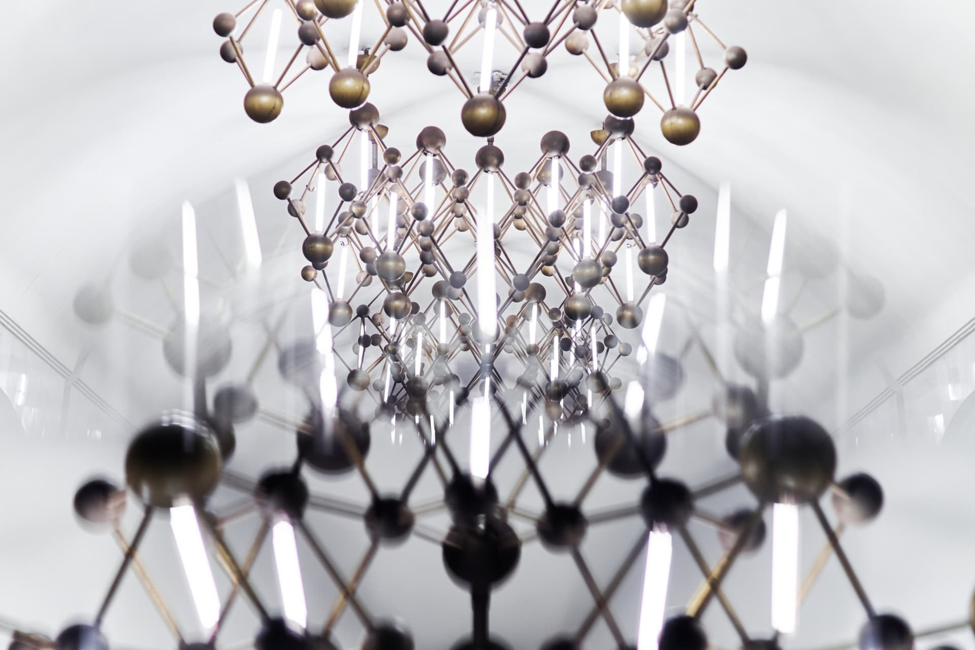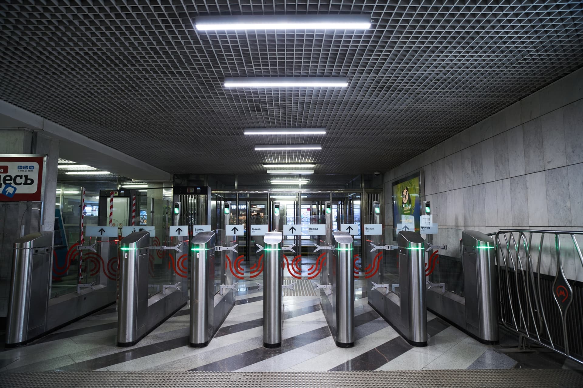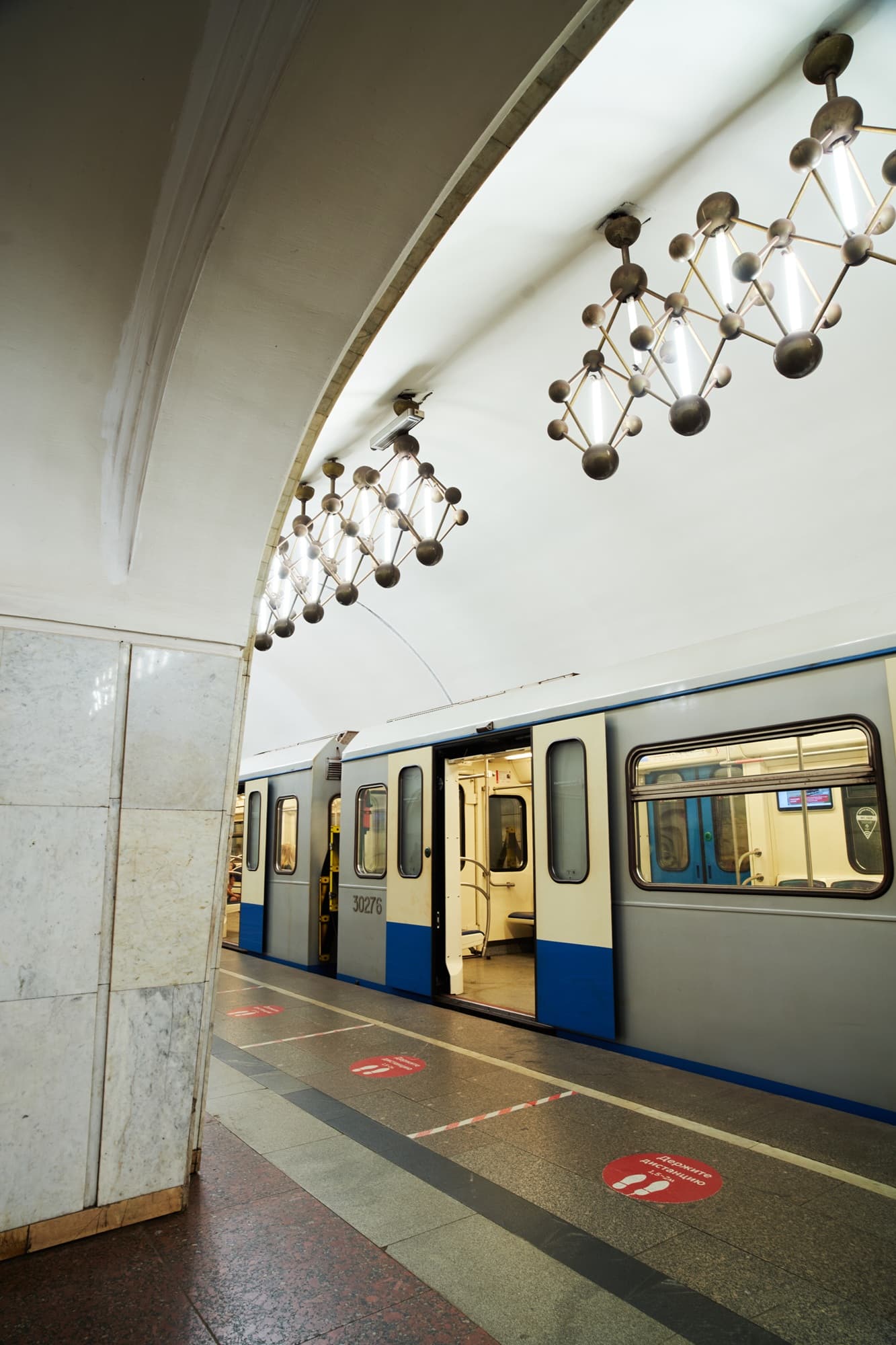 Ту же тему продолжают светильники, форма которых отсылает к кристаллической решетке. Благодаря этому оформление станции выстроено последовательно и подчинено единому замыслу.