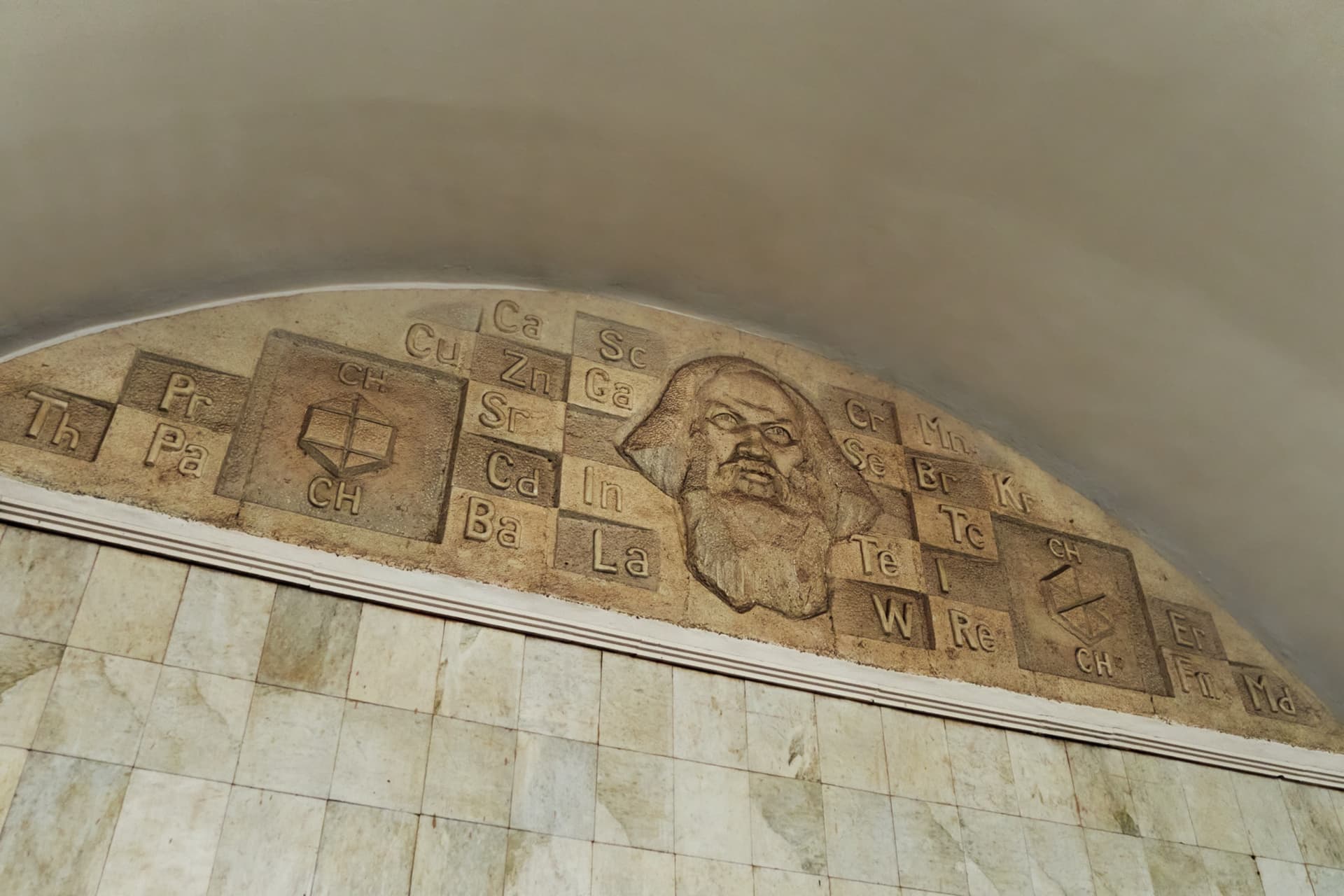 Первоначально художественное оформление предполагало более традиционный вариант. На путевых стенах предполагалось разместить портреты выдающихся деятелей отечественной химии, однако в итоге от этого замысла отказались. Вместо него были выполнены стилизованные изображения атомного и молекулярного строения. Это позволило сохранить научную тему, не превращая ее в прямую иллюстрацию.