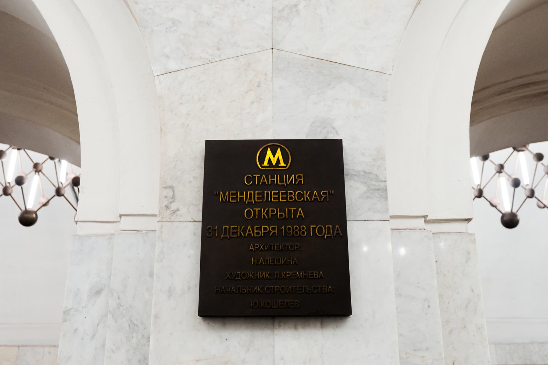 С «Менделеевской» Алёшину связывало и личное обстоятельство. До поступления в МАРХИ она два года занималась в Московском химико-технологическом институте имени Д.И. Менделеева. Поэтому станция, названная по институту, не была для нее случайной темой. Художественное оформление первоначально предполагало более традиционное решение, но в итоге на путевых стенах появились стилизованные изображения атомного и молекулярного строения. Это решение позволило уйти от прямолинейной иллюстративности и сохранить строгость архитектурного языка.