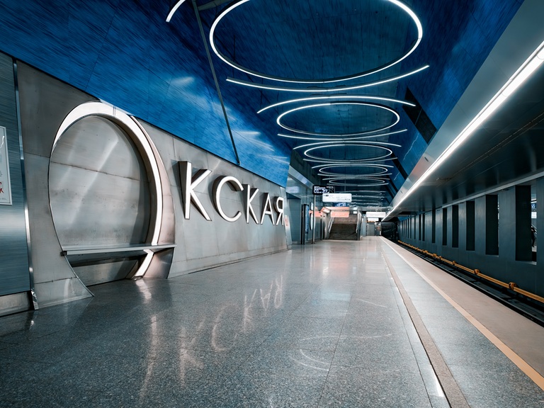 Отдельной деталью оформления стало крупное название станции, вынесенное из плоскости стены и подсвеченное изнутри. Буква «О» выполнена увеличенной и включена в оформление платформы как самостоятельный архитектурный элемент.