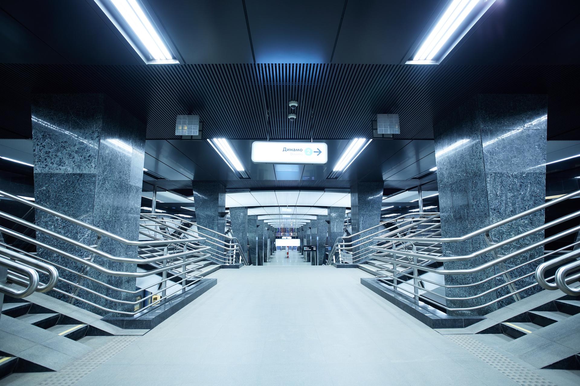 В отделке платформенного зала станции Большой кольцевой линии доминирует зеленый – цвет Замоскворецкой, пересадочной линии. Колонны, также выполненные из зеленого мрамора, напоминают факелы, символизирующие спортивные победы отечественных команд на легендарном стадионе «Динамо» («ВТБ – Арена»), расположенном поблизости. Пол выложен плитами из серого и черного гранита, а путевые стены отделаны классическим белым мрамором.