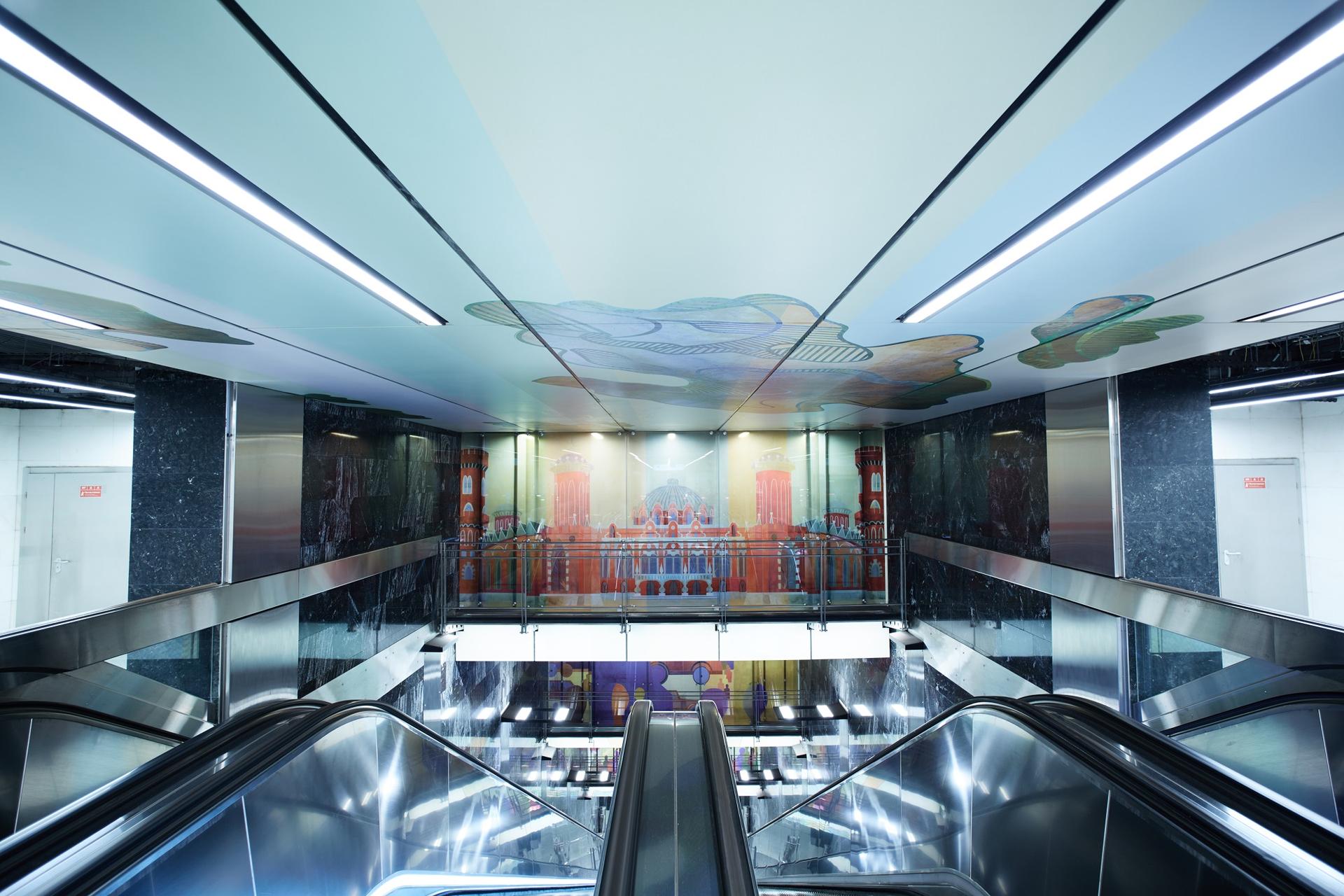 Вестибюли станции с двумя рядами колонн украшают декоративно-художественные композиции с изображениями Петровского парка и Екатерининского подъездного дворца. В вестибюлях на подвесных потолках размещены декоративные панно над эскалаторными наклонными ходами и в торцевых стенах эскалаторных спусков.