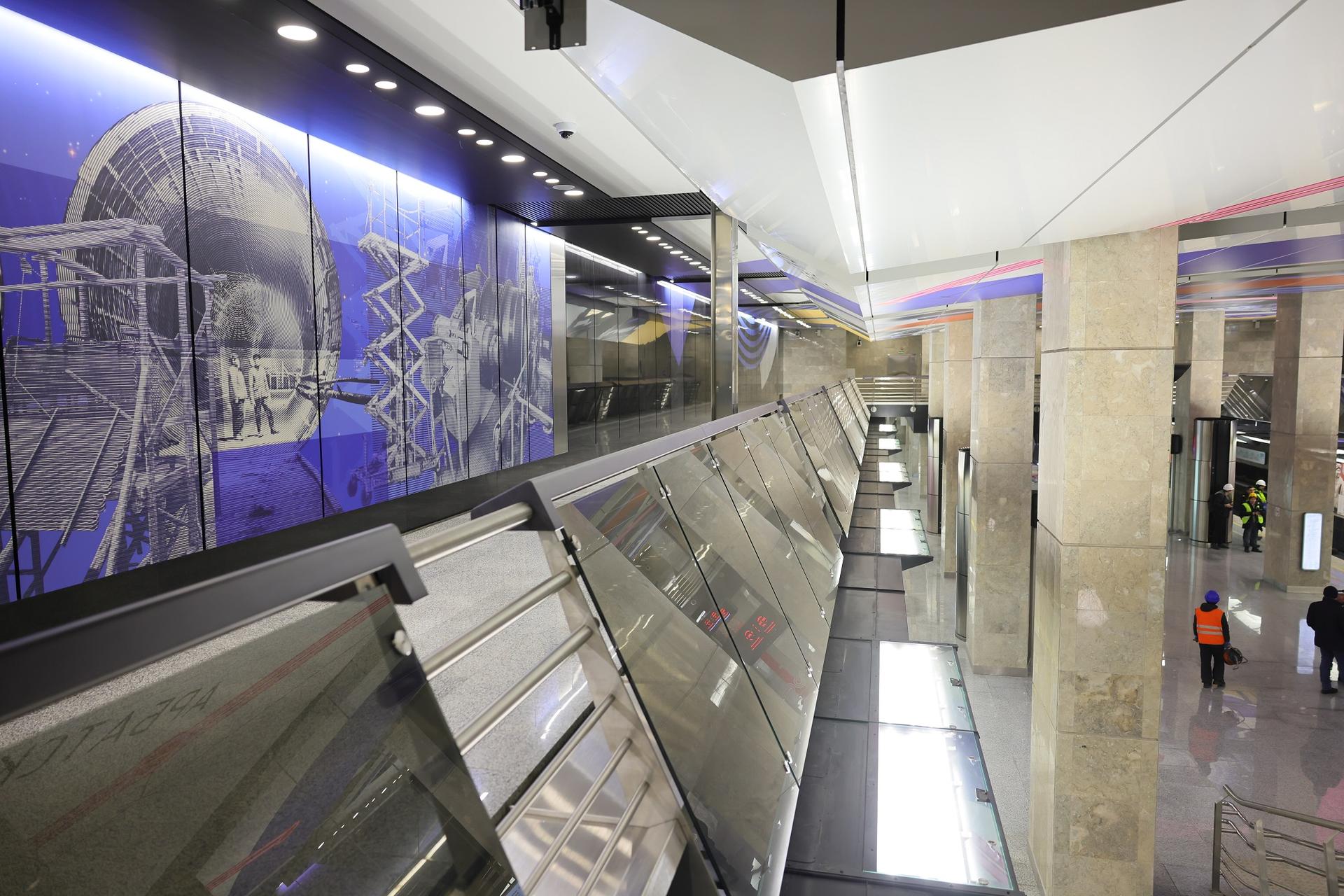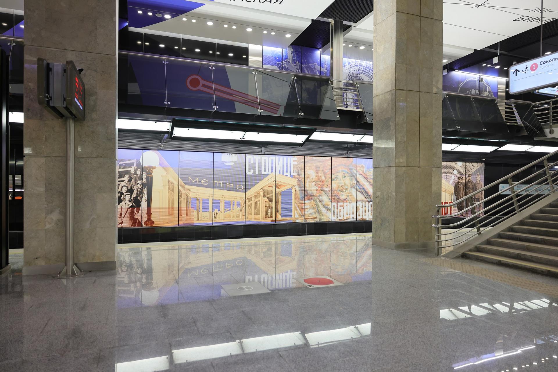 Декоративно-художественное оформление станции посвящено строительству самых первых станций Московского метрополитена в 1930-х годах. На светоотражающих панелях потолка разместились яркие, объемные фрагменты ностальгических плакатов предвоенных лет.