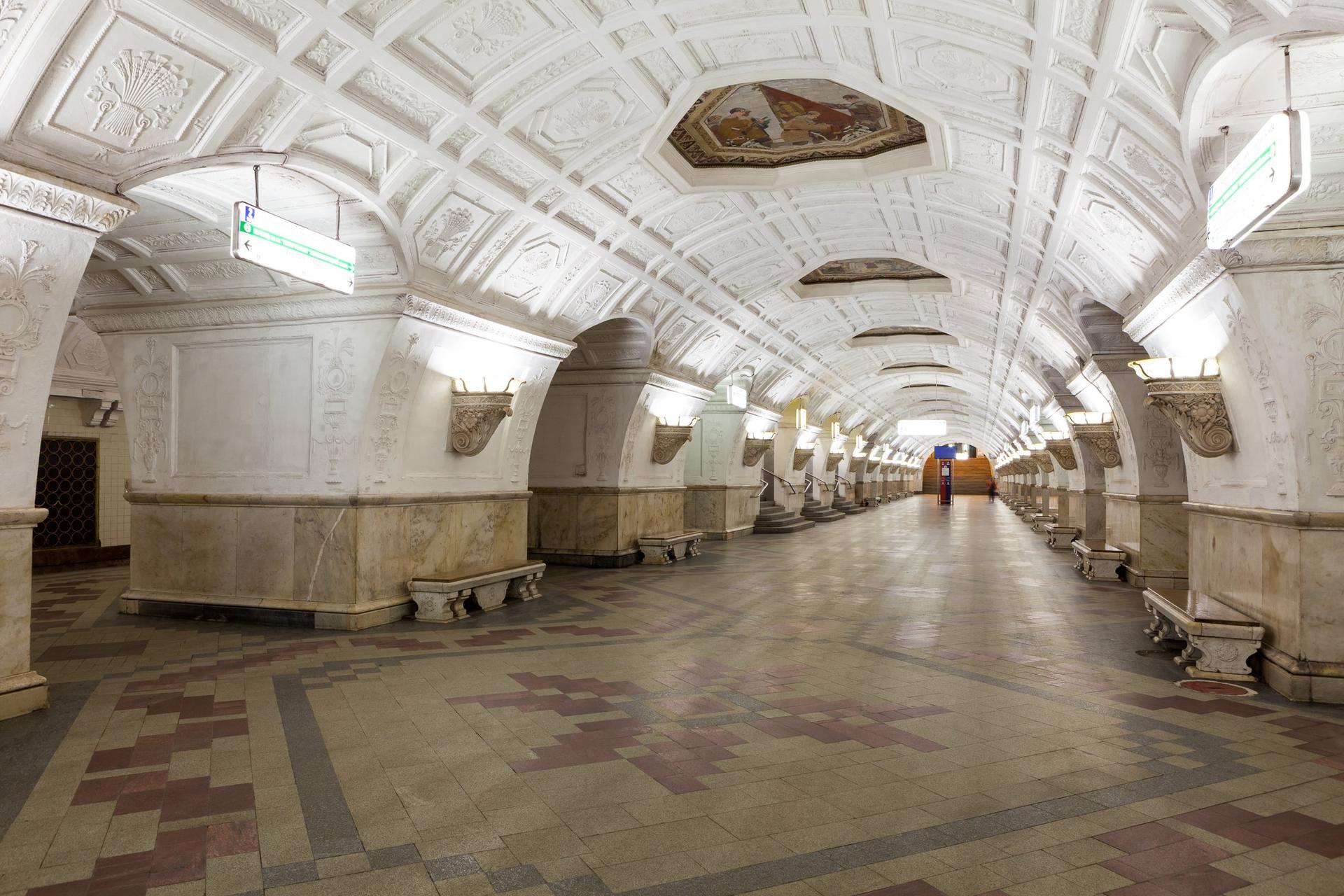Художественное оформление станции посвящено теме рассвета хозяйства и культуры Белоруссии. Цоколи пилонов облицованы светлым мрамором. На пилонах вазы-светильники из мрамора и стекла. Своды потолка декорированы рельефным орнаментом и, впервые примененными в сооружениях метрополитена, двенадцатью мраморно-мозаичными панно на тему рассвета хозяйства и культуры Советской Белоруссии (по эскизам художника Г.И. Опрышко, мастера мраморного завода Метростроя С. Волков, И. Морозов). Путевые стены облицованы белой керамической плиткой. Пол выложен мелкими керамическими плитками серого, белого и красного цветов и воспроизводит рисунки белорусской народной вышивки.