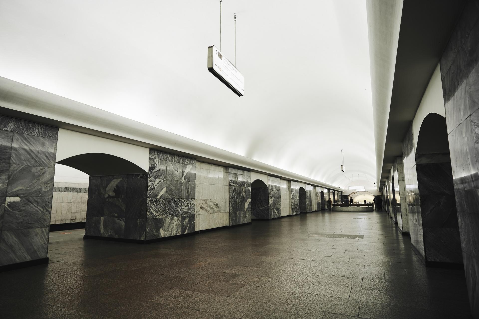Своды станционного зала поддерживают два ряда массивных спаренных пилонов, облицованных светлым уральским мрамором «коелга» и дымчатым мрамором «уфалей». Опоры свода скрыты широкими карнизами, за которыми размещены светильники. Пол выложен серым и розовым гранитом (до 1972 года покрытие было асфальтовым). По задумке архитектора Н.Я. Колли оформление станции должно было создать впечатление лёгкости, чтобы на пассажиров не давили своды и осознание того, что они находятся глубоко под землёй под толщей почв. «Задача, поставленная перед нами на станциях глубокого заложения, была гораздо труднее: огромному давлению земли пришлось противопоставить здесь такие мощные, тяжелые конструкции, что создать впечатление легкости и радостности в этих условиях было чрезвычайно трудно», - вспоминал позднее архитектор.