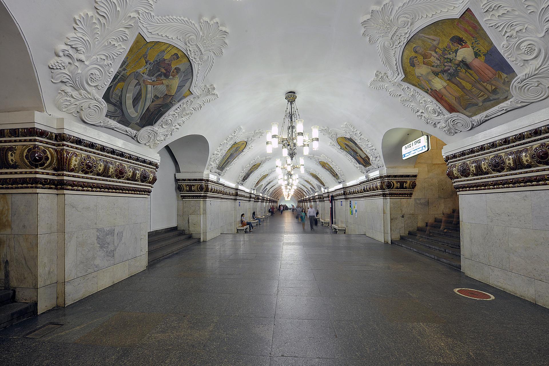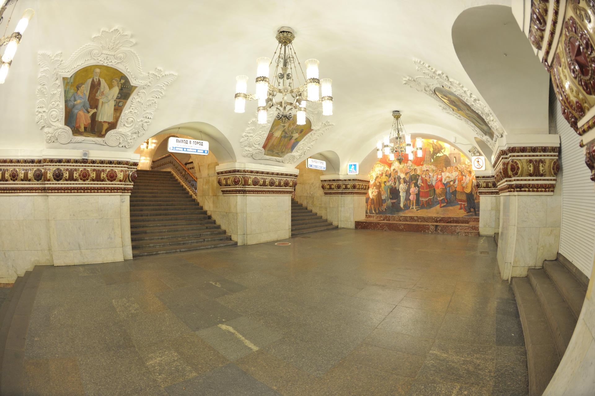 Оформление станции посвящено советской Украине и теме воссоединения Украины с Россией. Станция украшена большим количеством живописных полотен, выполненных в стиле социалистического реализма и технике фрески. Панно расположены на сводах центрального и боковых залов на пилонах. В центральном зале находятся сюжетные композиции, изображающие граждан советской Украины: «Архитекторы», «Физкультурники», «Энергетики», «Строители», «Овощеводы», «Железнодорожники», «Машиностроители», «Трудовая смена», «Хлеборобы», «Животноводы», «Учёные-химики» и «В детском саду».