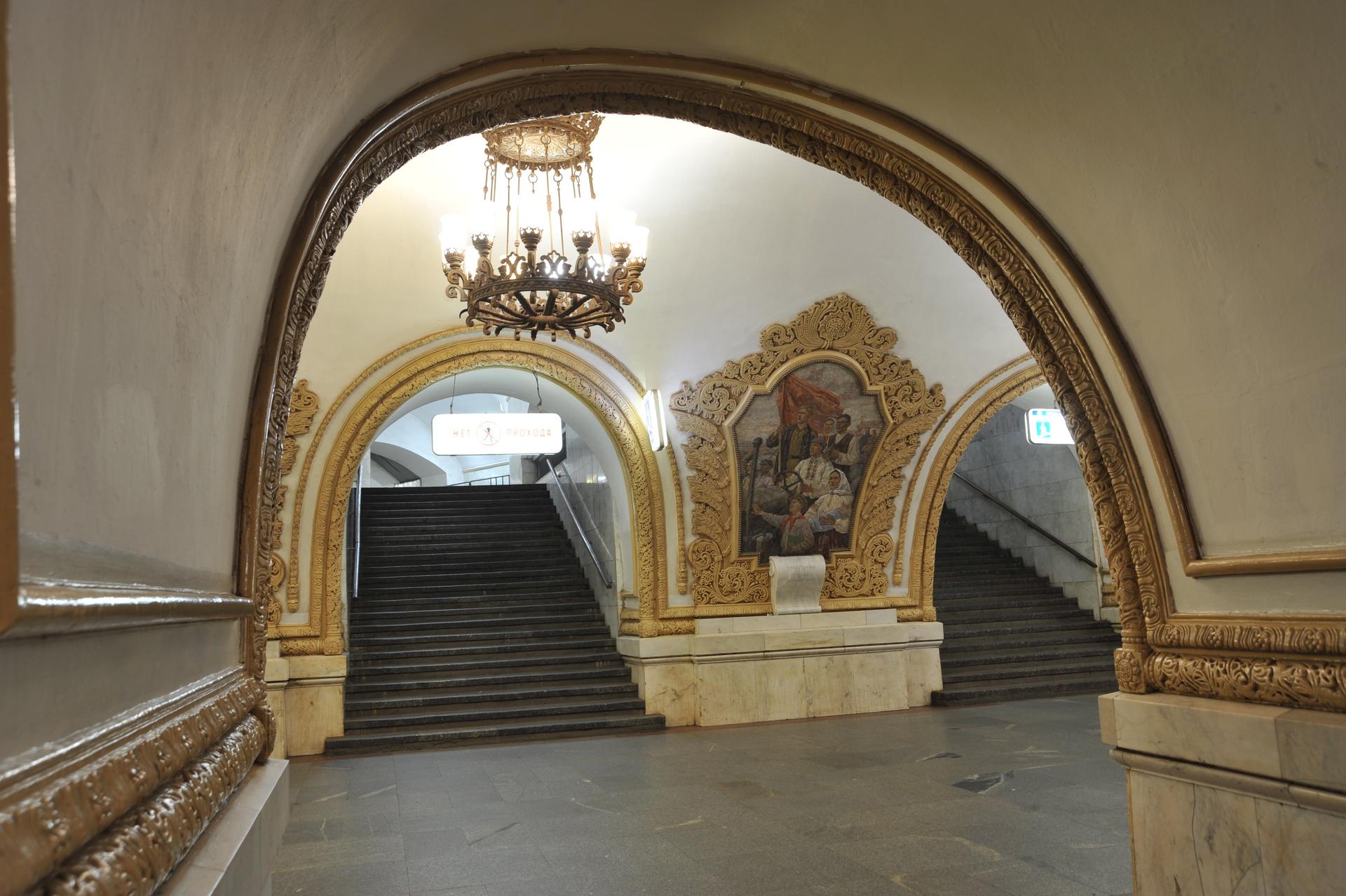 Художественное оформление станции посвящено теме дружбы российского и украинского народов. Проект выполнен киевскими зодчими и был выбран из семидесяти трех работ, представленных на конкурс. Центральная часть посадочного зала, перекрытая изящным белоснежным сводом, соединена с боковыми частями параболическими арками, окаймленными лепным жгутом, что характерно для украинской архитектуры семнадцатого века. 18 пилонов украшены мозаичными панно из смальты и ценных камней на тему единства России и Украины (художник А.В. Мизин). Путевые стены облицованы светлым мрамором. На торцевой стене центрального зала первоначально находился мраморный барельеф с портретами В.И. Ленина и И.В. Сталина; сегодня в центре барельефа мозаичный портрет одного Ленина. По кромке торцевой стены – строка из гимна СССР. Станцию украшают роскошные золотистые люстры, освещающие центральный зал.