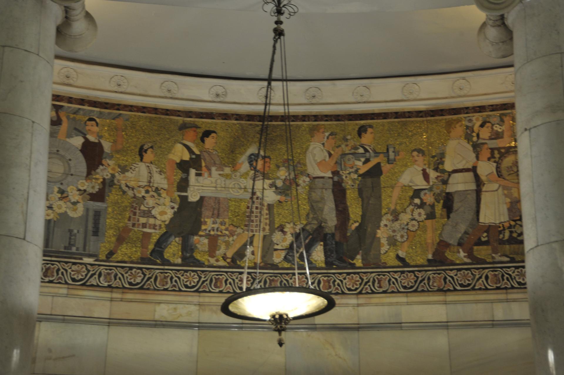 На одной из мозаик — «Борьба за Советскую власть на Украине» изображён партизан, который использует переносной телефон на базе штабного телефона FF-17, который производился с 1910 г. по 1920 г. в Германии. Причём тяжёлую трубку партизан держит двумя руками. Некоторые современные пассажиры принимают его за мобильный телефон, КПК и ноутбук.