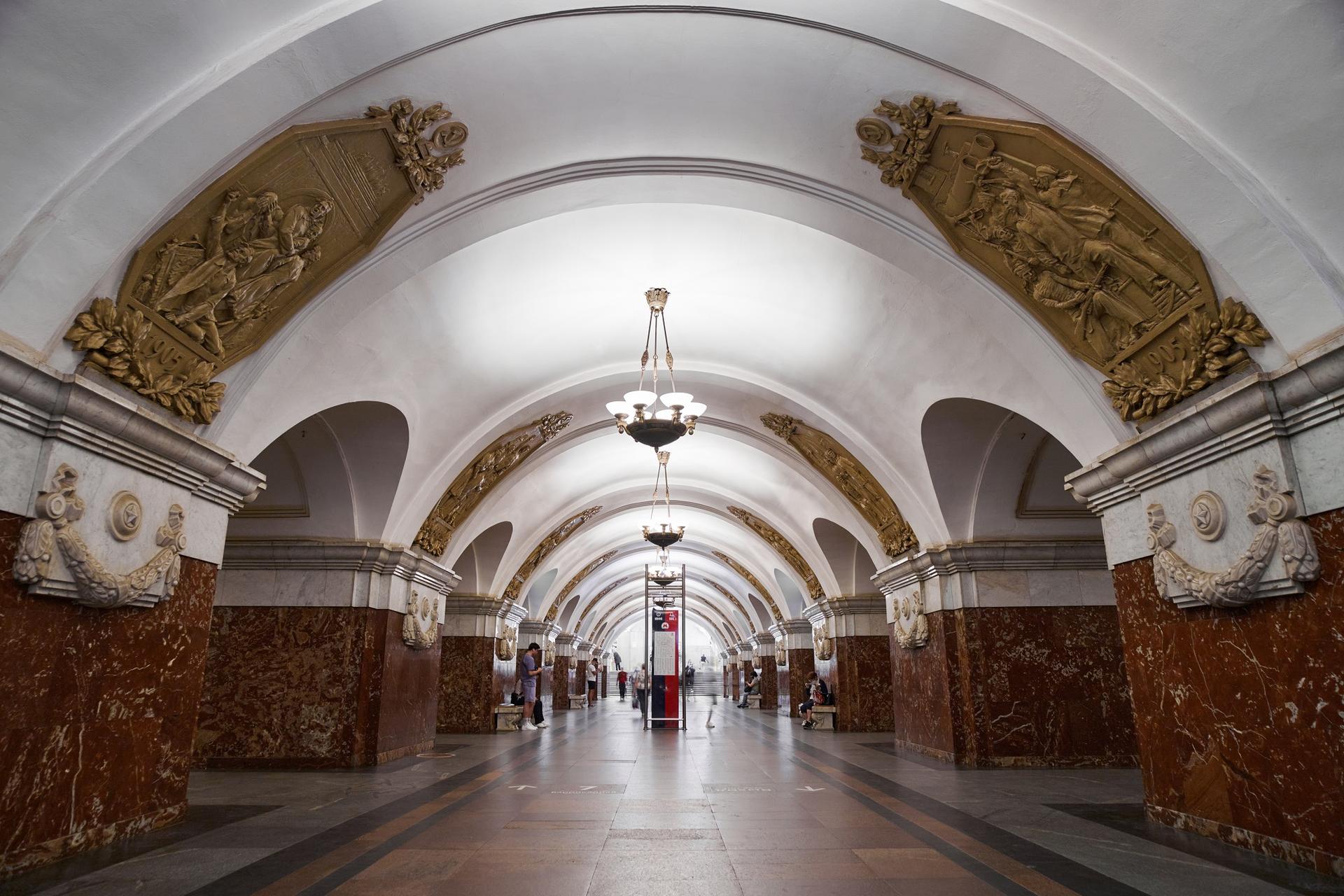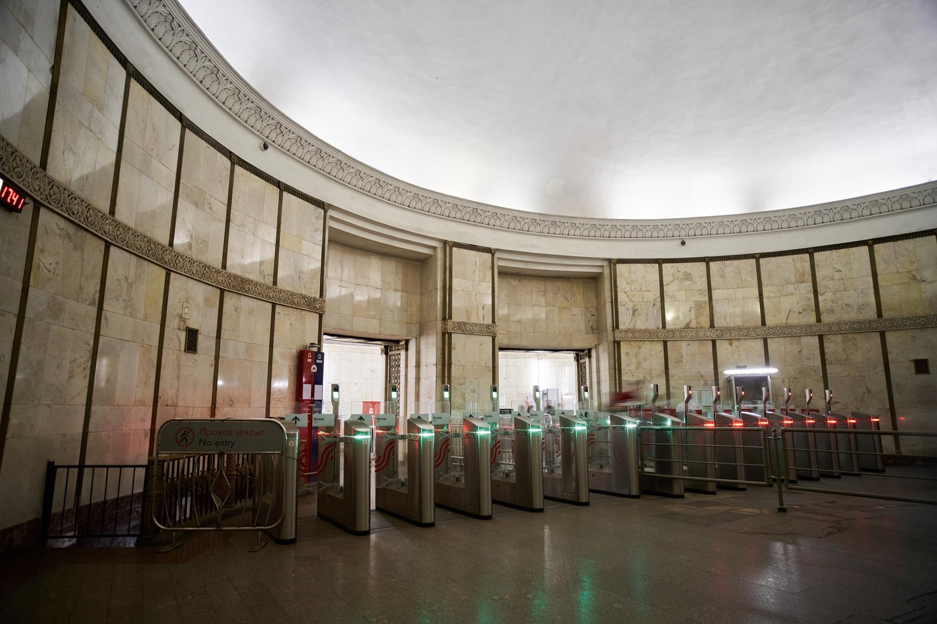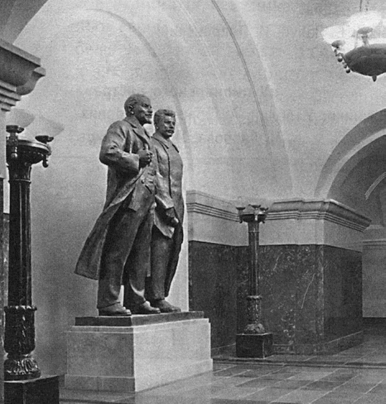В северном торце станции, где сначала стояла скульптура В.И. Ленина и И.В. Сталина, сейчас расположен переход.