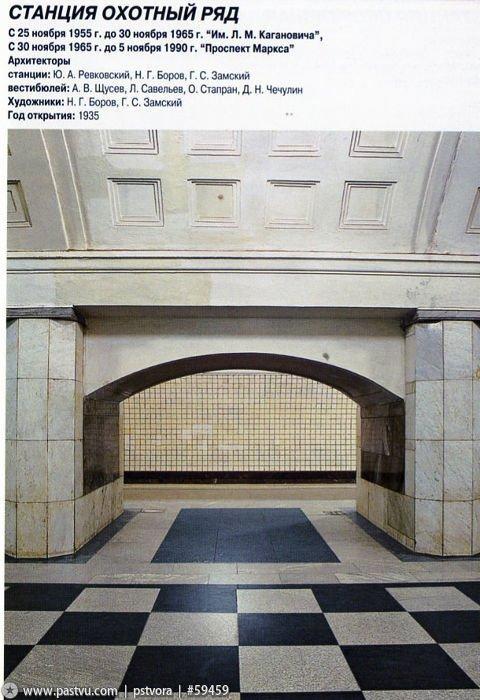 Открыта 15 мая 1935 в составе первой очереди Московского Метрополитена. До 25 ноября 1955 года она носила название «Охотный ряд», затем до осени 1957 года – «имени Л.М. Кагановича», после вновь переименована в «Охотный ряд», но 30 ноября 1961 года она стала «Проспектом Маркса». И лишь 5 ноября 1990 года старое название «Охотный ряд» вновь вернулось к станции.