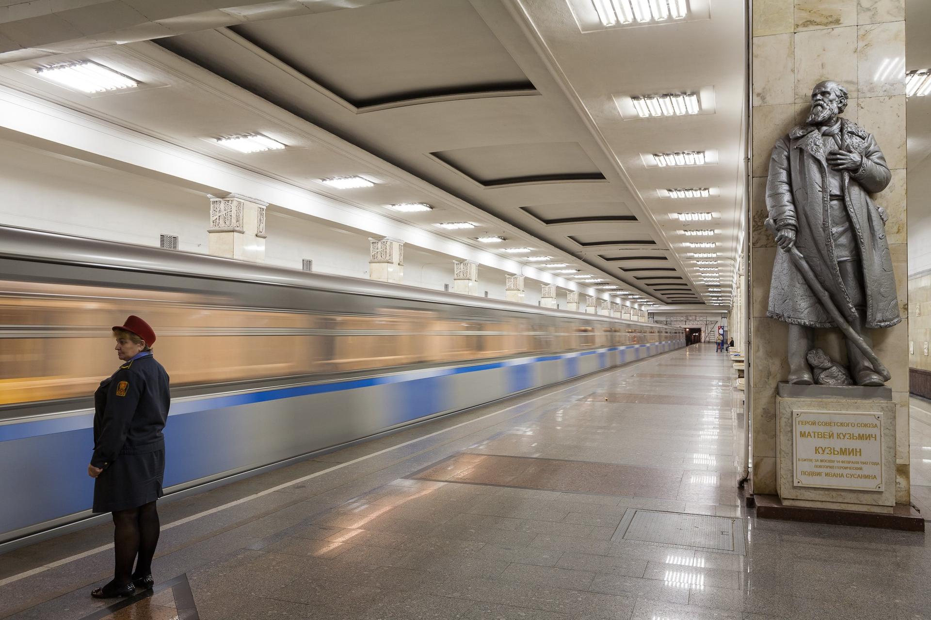 Оформление станции посвящено теме партизанского движения в годы Великой Отечественной войны. Легкие квадратные колонны станционного зала облицованы белым мрамором. Путевые стены отделаны вверху белым мрамором, внизу - коричневой керамической плиткой, и украшены барельефами работы скульптора С.Л. Рабиновича. На платформах у ближайших к выходу колонн установлены скульптуры героев-партизан Зои Космодемьянской и 80-летнего крестьянина-колхозника Матвея Кузьмина, повторившего в 1941 году подвиг Ивана Сусанина и заведшего немецкий отряд в гибельные болота (скульптор М.Г. Манизер). Над средним путём имеются ниши в потолке станции. После открытия станции в них находились светильники и фрески (художник А.Д. Гончаров). Ни фреска, ни светильники до наших дней не сохранились. К выходу ведут широкие гранитные лестницы. На промежуточной площадке установлена скульптурная группа "Народные мстители" (скульптор М.Г. Манизер). Стены наземного павильона облицованы белым и красным мрамором.