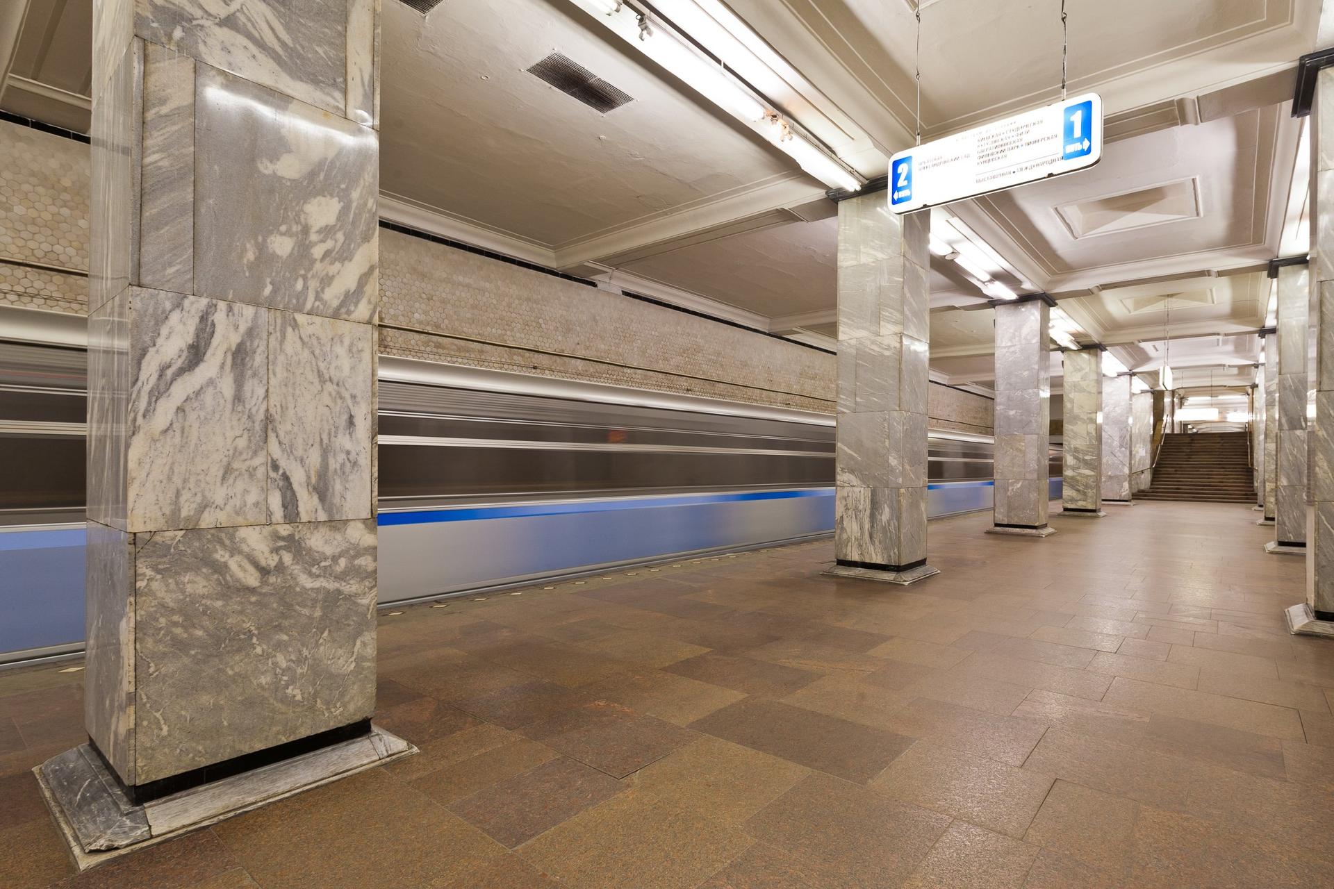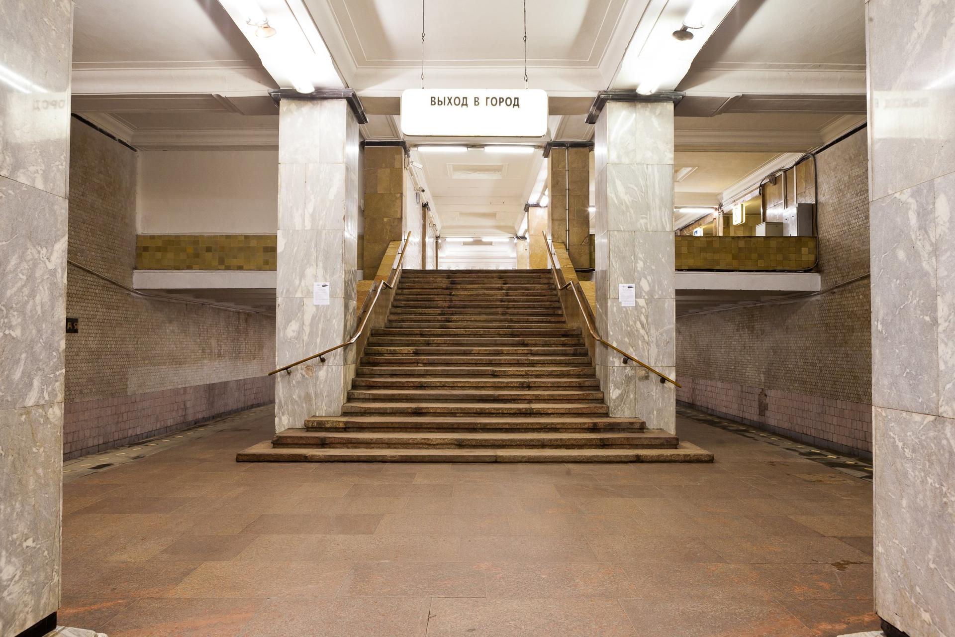 Путевые стены облицованы вверху розовой, а внизу - серой метлахской плиткой в форме сот. Квадратные колонны облицованы серым мрамором. Пол выложен розовым гранитом.