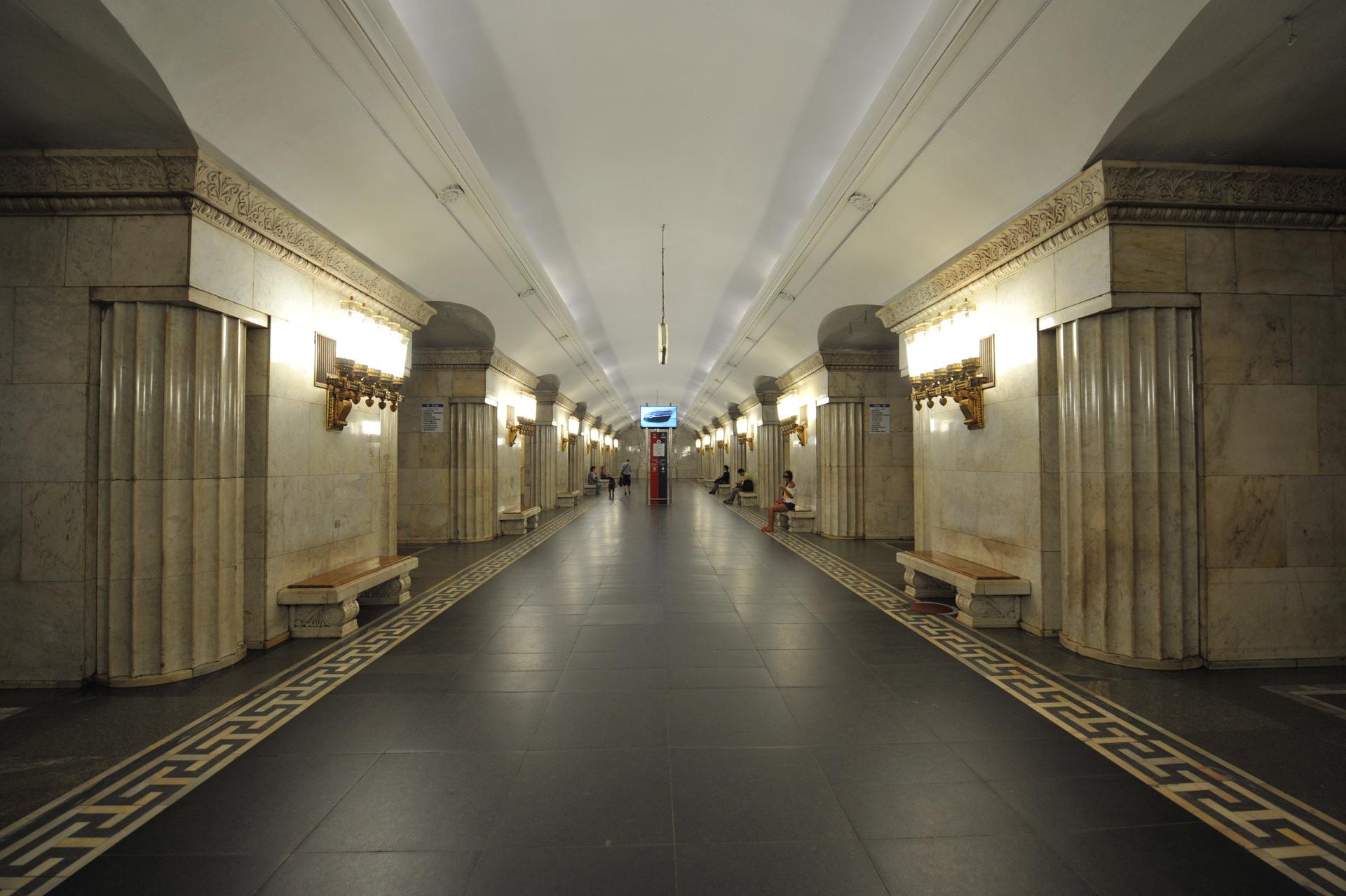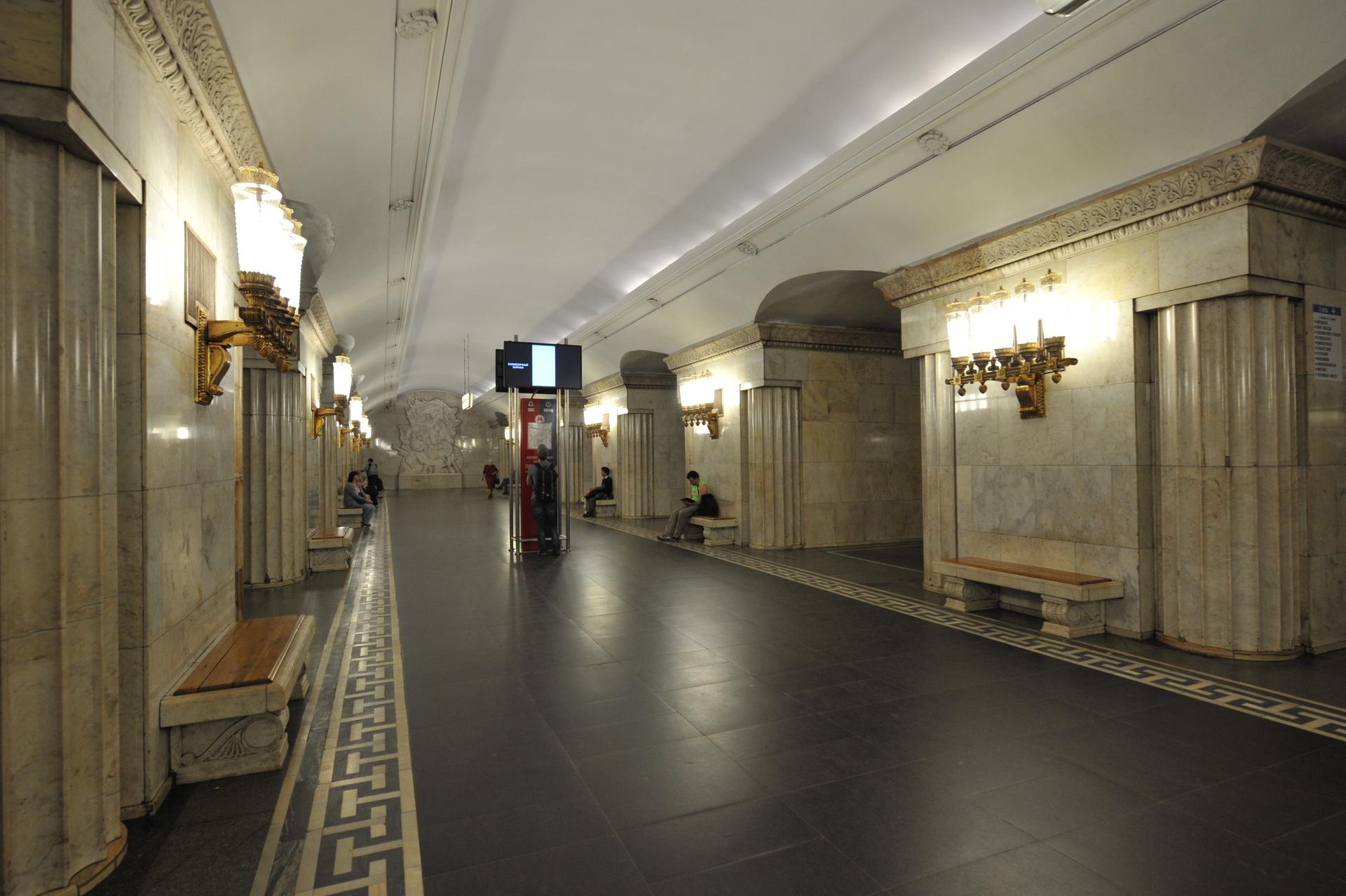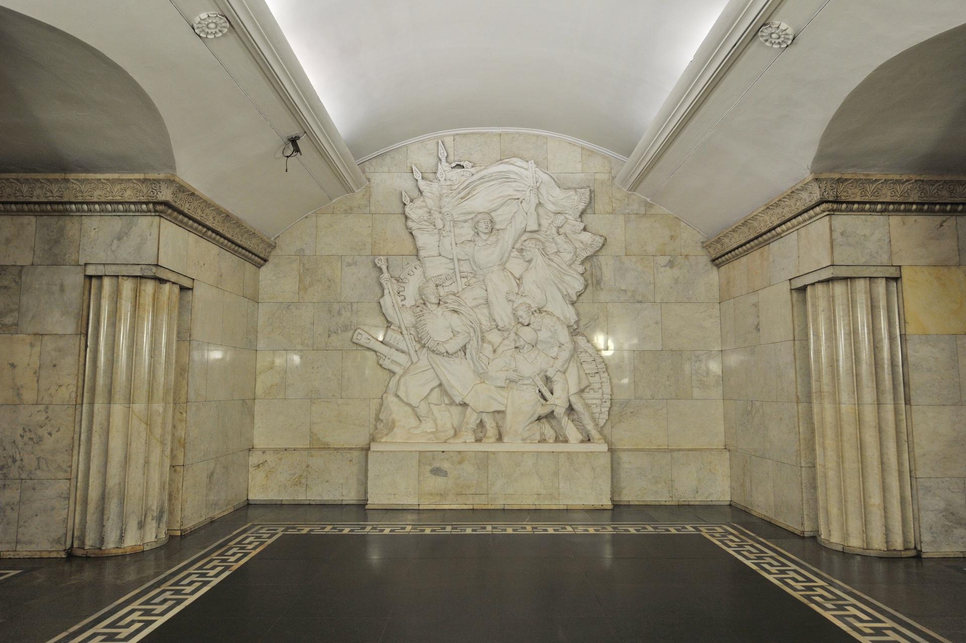 В оформлении станции отражена тема героической борьбы и побед русского народа над иноземными захватчиками. Квадратные пилоны станционного зала покрыты белым мрамором и украшены по углам полуколоннами и резными белокаменными карнизами. Бронзовые канделябры поддерживают светильники на пилонах. Также светильники скрыты за широким карнизом на своде центрального зала. Пол выложен серым гранитом, путевые стены белой глазурованной керамической плиткой, цоколь - чёрным мрамором. Торцевую стену центрального зала украшает горельеф на тему защиты Родины (скульптор Г.И. Мотовилов).