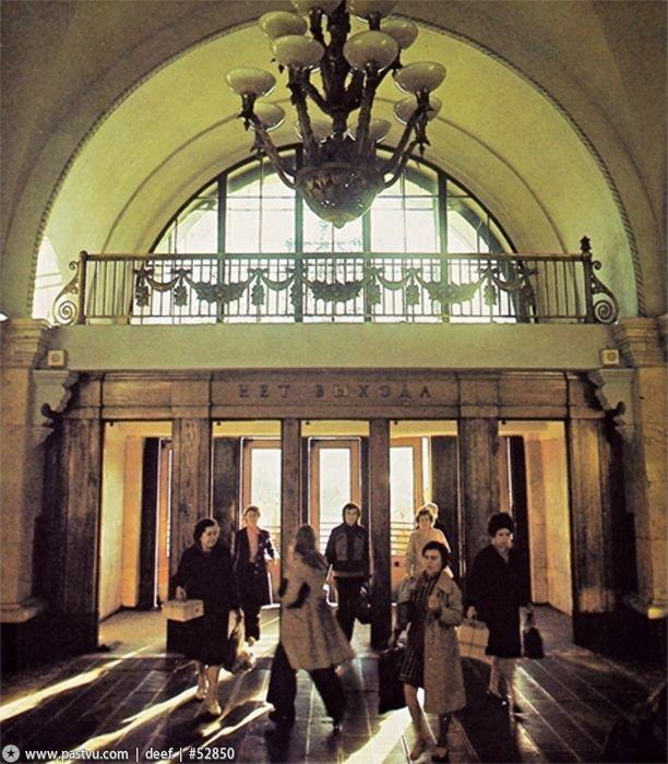 В отделке станции преобладают отштукатуренные элементы. Путевые стены здания в стиле "барокко" покрыты вверху белой, а внизу черной керамической плиткой. Низ пилонов облицован красным мрамором. Примечательно, что в оформлении станции практически отсутствует тема войны, это нехарактерно для станций послевоенного периода. Единственное напоминание о ней – мозаичный парадный портрет И.В. Сталина во весь рост (автор Г.И. Опрышко), который находился на стене напротив эскалаторной арки. В 1955 году в процессе борьбы с культом личности мозаику разобрали. Сейчас это просто белое вертикальное полотно на белой стене.